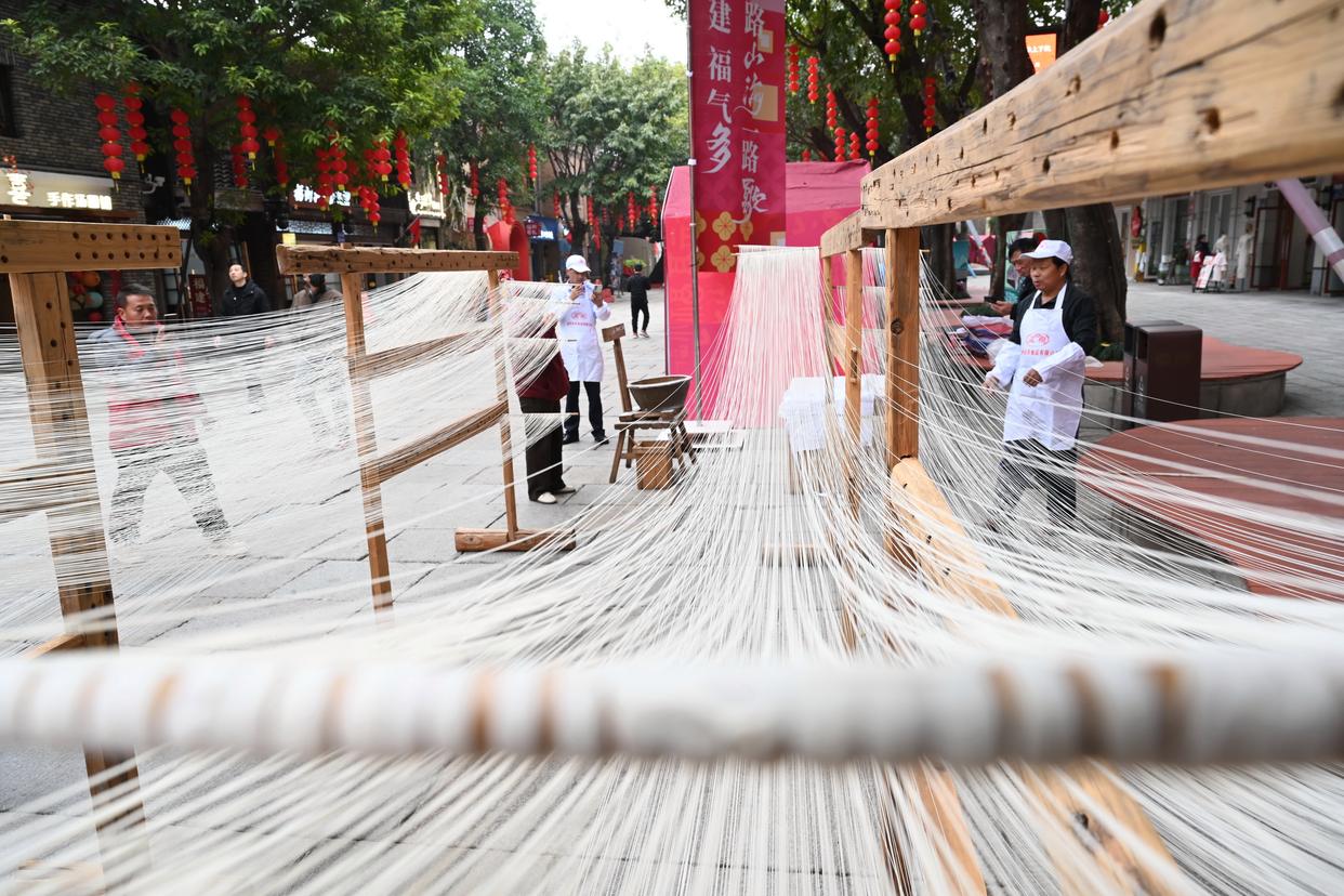2月6日,工作人员在福州上下杭历史文化街区向市民游客展示福州拉线面技艺。新华社记者 林善传 摄