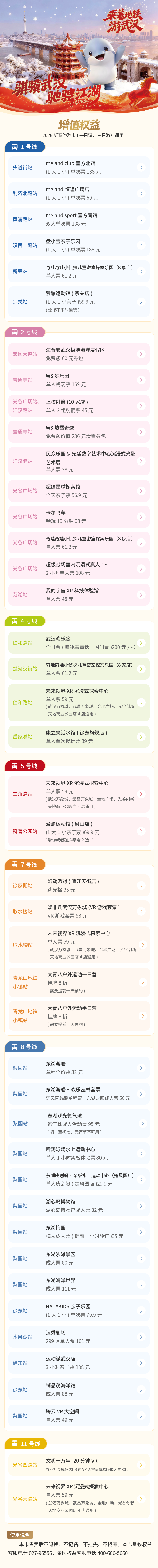 01 2026新春旅游卡 乘着地铁,游遍武汉 👆️点击图片,直接购卡 一日游 新春旅游卡 🚇 激活后24小时内可无限次乘坐地铁 🎫 免费游览园博园花灯会1次(有效期至2026年3月22日) 📍 优惠畅玩40+地铁沿线好去处,详见02部分(有效期至2026年3月22日) 💰️38元/张 三日游 新春旅游卡 🚇 激活后72小时内可无限次乘坐地铁 🎫 免费游览园博园花灯会1次、黄鹤楼日场一次(有效期至2026年3月22日) 📍 优惠畅玩40+地铁沿线好去处,详见02部分(有效期至2026年3月22日) 💰️88元/张 新春旅游卡答疑 如何激活?怎么核销?客服电话? 上下滑动查看更多 🙋♀️预约平台是否有客服电话? 地铁卡相关问题,可咨询客服电话027-96556 景区权益相关问题,可咨询客服电话400-606-5660 🙋♀️【新春旅游卡】如何购买? 【新春旅游卡】为实体卡,【武汉文旅】小程序为该卡唯一销售平台。在【武汉文旅】微信小程序购卡后,可选择线下领取实体卡或邮寄到付。 搜索【武汉文旅】微信小程序,点击购卡页面,选择线下领取或邮寄到付(运费自理)。 🙋♀️【新春旅游卡】如何领取、使用? 选择线下领取的用户,于2月13日起在地铁2/6号线江汉路,2/4号线洪山广场服务中心领取实体卡,凭卡可享受景区权益与增值权益。(增值权益详见02部分)。 地铁权益需在武汉任意地铁站服务中心激活后使用。 2号线江汉路:027-83482612 6号线江汉路:027-83486582 2/4号线洪山广场:027-83482712 车站客服中心具体位置: 2号线江汉路:负一层站厅B、C口侧 6号线江汉路:站厅中部 2/4号线洪山广场:负一层E、F口侧 🙋♀️【一日卡】【三日卡】使用时限如何计算? ①地铁权益 一日卡激活后24小时内、三日卡激活后72小时内,可无限次乘坐武汉地铁。 ②景区权益 一日卡可于2026年3月22日前免费游览园博园花灯会1次; 三日卡可于2026年3月22日前免费游览园博园花灯会1次、免费游览黄鹤楼日场1次 ③增值权益 凭本卡可享受地铁沿线41家合作商户(详见02部分)专属折扣,线下门店出示此卡享折扣,有效期截至2026年3月22日。 🙋♀️购卡成功后,如何兑换园博园/黄鹤楼公园门票?需要提前预约吗? 不需要提前预约,直接凭卡在景区手持机处核销即可。 🙋♀️线下41家商户专属折扣怎么兑换?一张卡可以享受多家商户折扣吗? 直接凭卡在对应商户使用优惠,一张卡可以同时享受41家商户折扣。 🙋♀️【新春旅游卡】一人能买几张?忘记使用可以退卡吗? A:新春旅游卡同一账户限购一张,购买后不退换、不挂失、不找零。