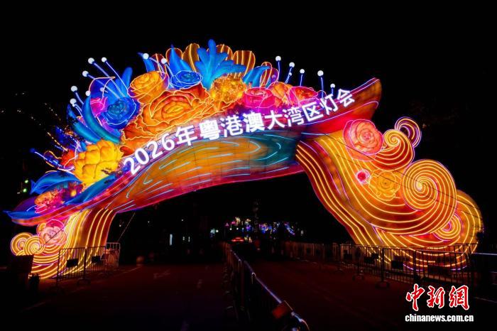 中新社广州2月10日电(记者方伟彬)以“湾区同心·华彩千秋”为主题的2026年粤港澳大湾区灯会亮灯仪式10日晚在广州南沙天后宫举行,标志着这场展期长达90天的湾区灯会正式开园迎客。