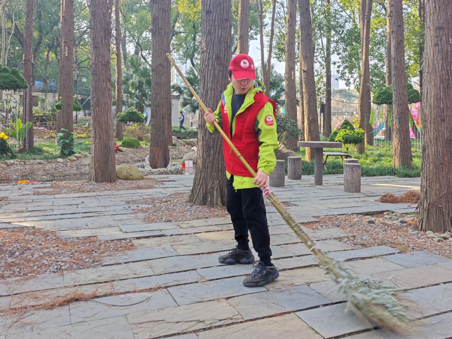 看到林间休息区地面上有大量落叶,志愿者陶俊二话不说就拿起扫把,协助保洁人员清扫干净。“我来搭把手!多个人多份力,扫干净了大家来了也舒心,干着特带劲!”