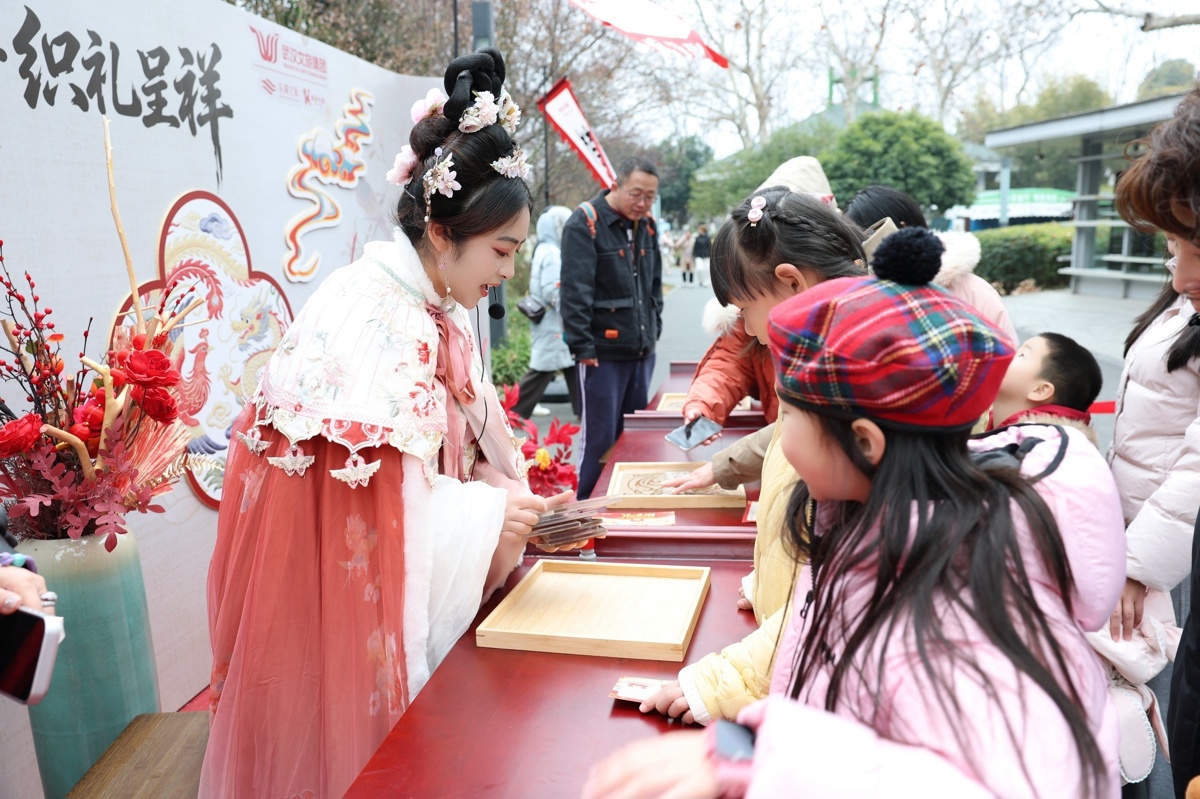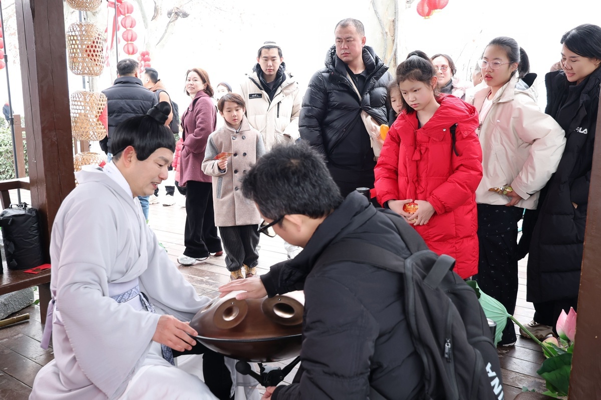 “屈原”点位前,“诗一签,福一年”吸引不少诗词爱好者;游客抽取诗词签对出下句,赢取“诗礼之瑞”。“伯牙”处空灵手碟声此起彼伏,挑战者凝神敲击,奏响新年“知音”;“织女”的凤凰图腾拼图前排起长龙,孩子们瞪大眼睛记图案,小手飞快拼合;“楚王”投壶区喝彩不断,五箭中三者自豪挥拳;“凤女”猜谜对诗更是欢声笑语。