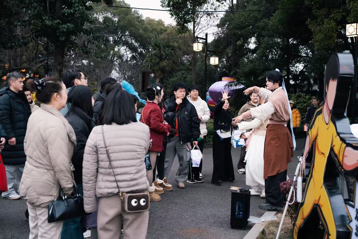 据介绍,游园会精心打造“日赏+夜游”双模式,让游客从晨光微熹到暮色四合,都能收获满满乐趣。白天的园区,热闹非凡、烟火气十足,“抓马”大巡游踏着欢快的节奏登场,身着国潮服饰的演员们载歌载舞,舞狮、民俗杂耍轮番上演,锣鼓声、欢笑声此起彼伏;国潮NPC随机现身,“容嬷嬷”大战“白娘子”,“唐僧”放下紧箍咒,“包租婆”向“至尊宝”租借月光宝盒,各种CP打破次元壁在此相遇;主题市集上,糖画、面人等非遗技艺轮番亮相,汉味小吃香气四溢,文创好物琳琅满目,不少游客驻足挑选,感受市井烟火里的新春暖意;投壶、猜灯谜等年俗游戏前,大人小孩排起长队,沉浸式体验传统年俗的乐趣,一张张笑脸定格新春美好。