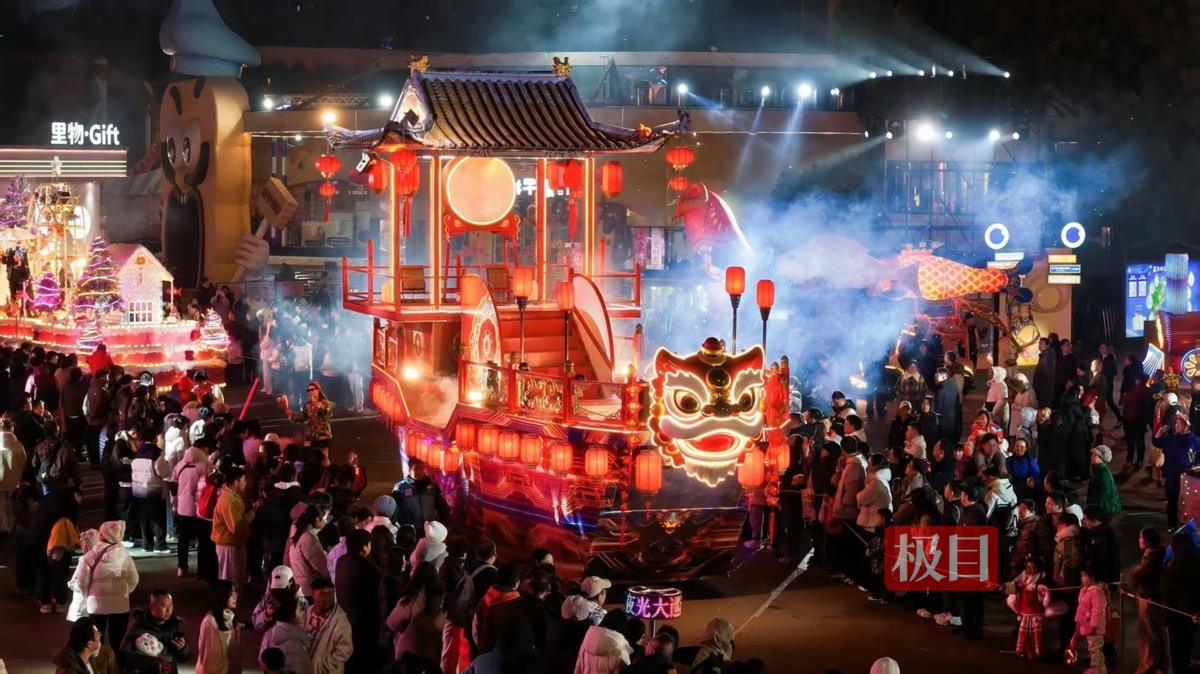 武汉欢乐谷喜气盈门夜光大巡游现场,飞天鳌鱼领衔,光影彩车随机飘雪,NPC热闹互动,年味拉满。