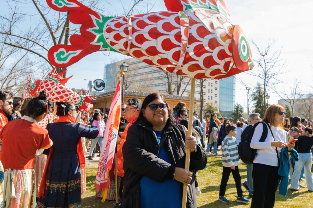 在活动巡游中,华人社团的表演队伍身着传统服饰,与马德里孔子学院师生、乌塞拉区中小学生一同,将公园变成充满音乐、色彩与创意的露天大舞台。