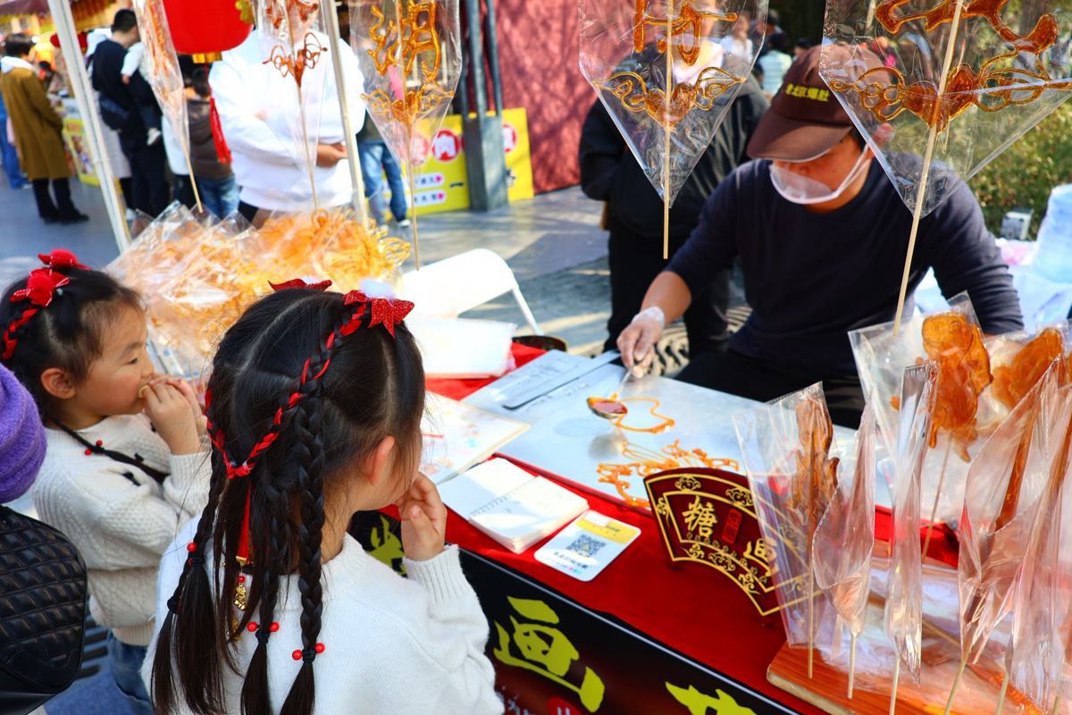 沿着绿道前行,新春市集点缀其间。虽然人流量不小,但市集内并不显拥挤,反而呈现出一种恰到好处的热闹。大红灯笼、中国结等氛围装饰错落有致,将节日的仪式感拉满。游客们或是在手工艺品摊位前悠闲地挑选,或是举着刚买的糖葫芦在装饰墙前打卡,脸上洋溢着轻松的笑容。一位摊主告诉记者:“大家更像是来散步踏青,顺道感受一下节日气氛,买点喜欢的小玩意,这种状态特别好。”