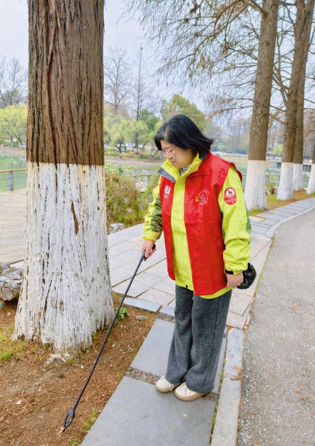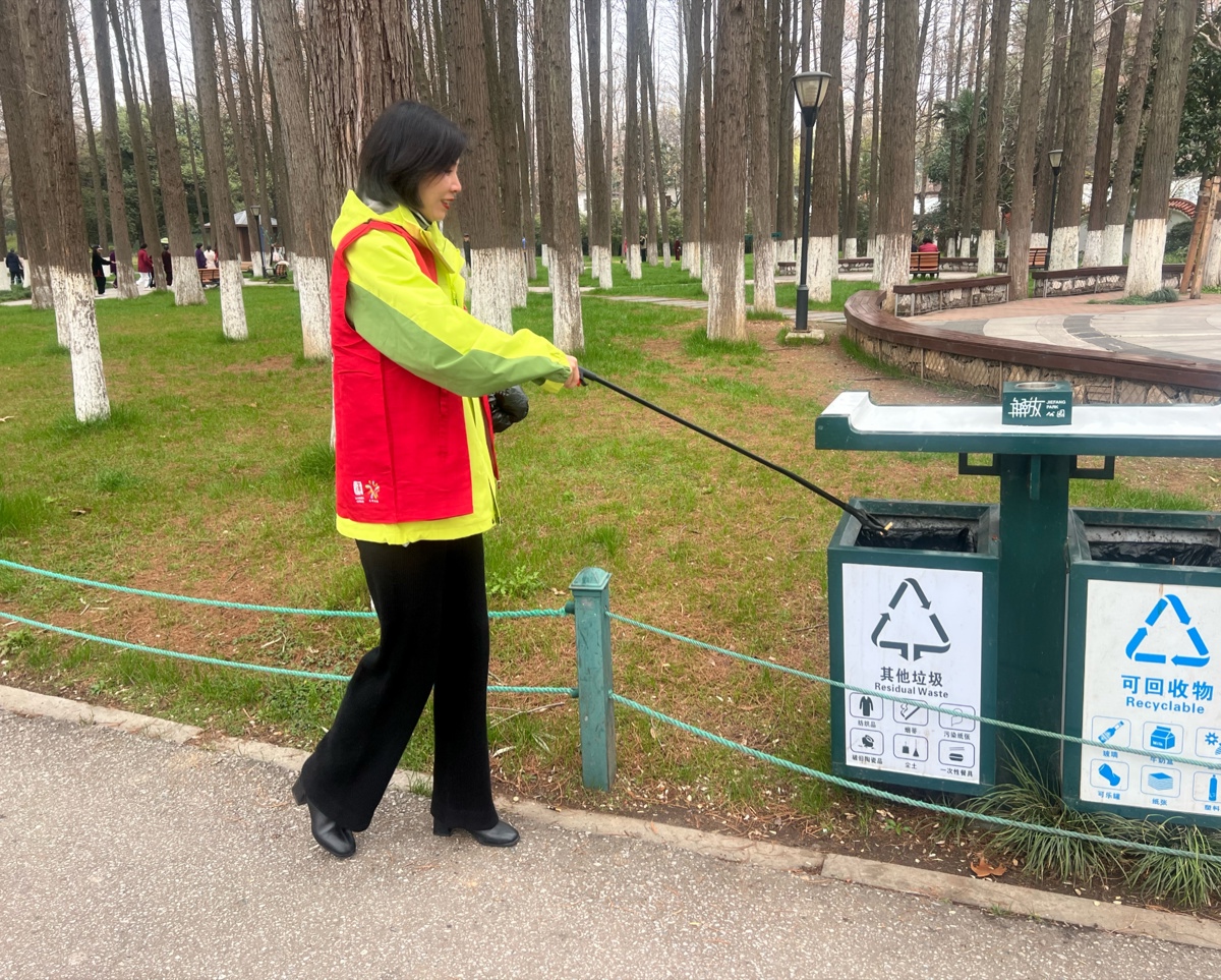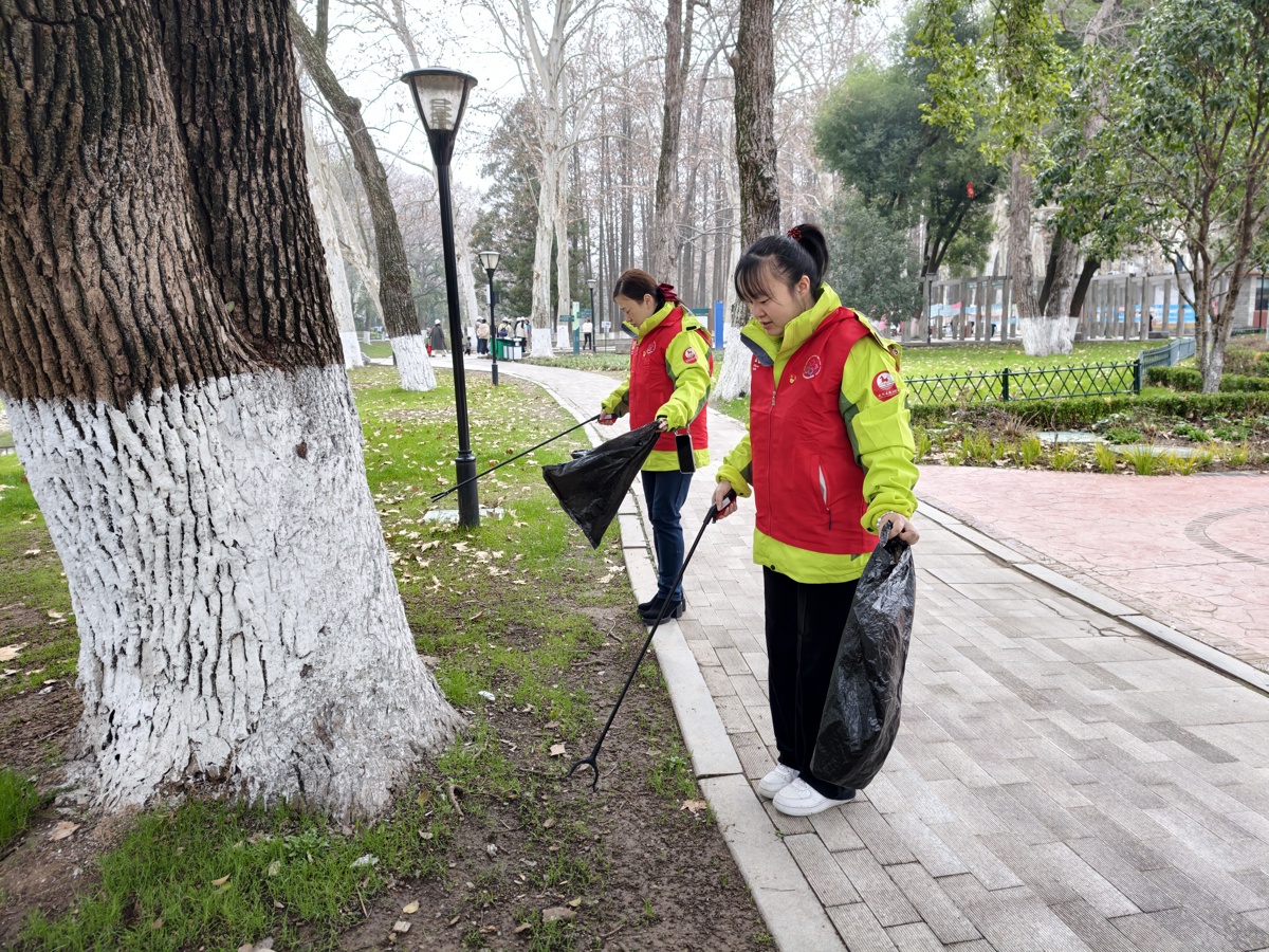 几名志愿者手持垃圾袋和夹子,沿着园区步道、草坪细致清理纸屑、烟头、塑料杂物,用双手守护园区的整洁美观,倡导“无痕赏花、绿色出游”的理念。