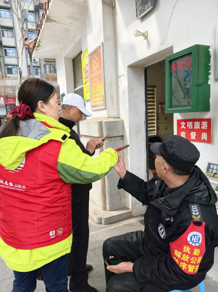 活动现场,一位白发苍苍的老年游客被志愿者们的热情真诚所打动。他主动告诉志愿者们,自己也是党员,有五十年党龄了。老人提议合影,红马甲们立刻围拢过来,搀扶着老人并肩而立。快门落下,大家胸前的党徽与志愿红的热忱相映成辉,在这个特殊的日子里,定格下最温暖的瞬间。