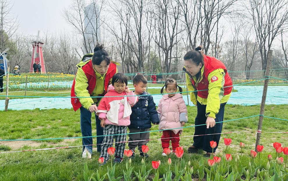 此时的解放公园,郁金香已成片盛开,吸引了市民游客驻足观赏、拍照打卡,志愿者们温柔地提醒游客“文明赏花,请勿攀折花枝、踩踏绿地”。遇到有游客俯身靠近花枝拍照时,她们会上前轻声劝导并帮忙调整角度,既守护了花草,也留住了游客与春日的美好合影。遇到孩童,她们会蹲下来,耐心地科普郁金香的种类与来源。