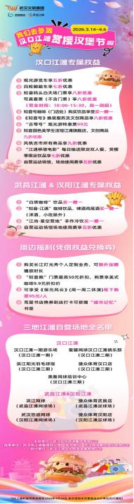 凭此券,市民游客可在汉口江滩享受观光车、自营运动场馆等低至五折的优惠,知音码头、知音号相关体验及文创也可享受八折福利;在武昌、汉阳江滩,多家咖啡饮品买一赠一,自营运动场馆同样五折开放。此外,凭券还可享受跨业态福利,如长江灯光秀个人定制业务加赠播放时长,知音殿购票折扣,《保元风云》线下购票专享优惠,茑屋书店到店打卡获赠“城市记忆”书签等。所有福利使用有效期至2026年4月20日,真正实现了市民游客吃玩赏游一站式畅享春日美好。