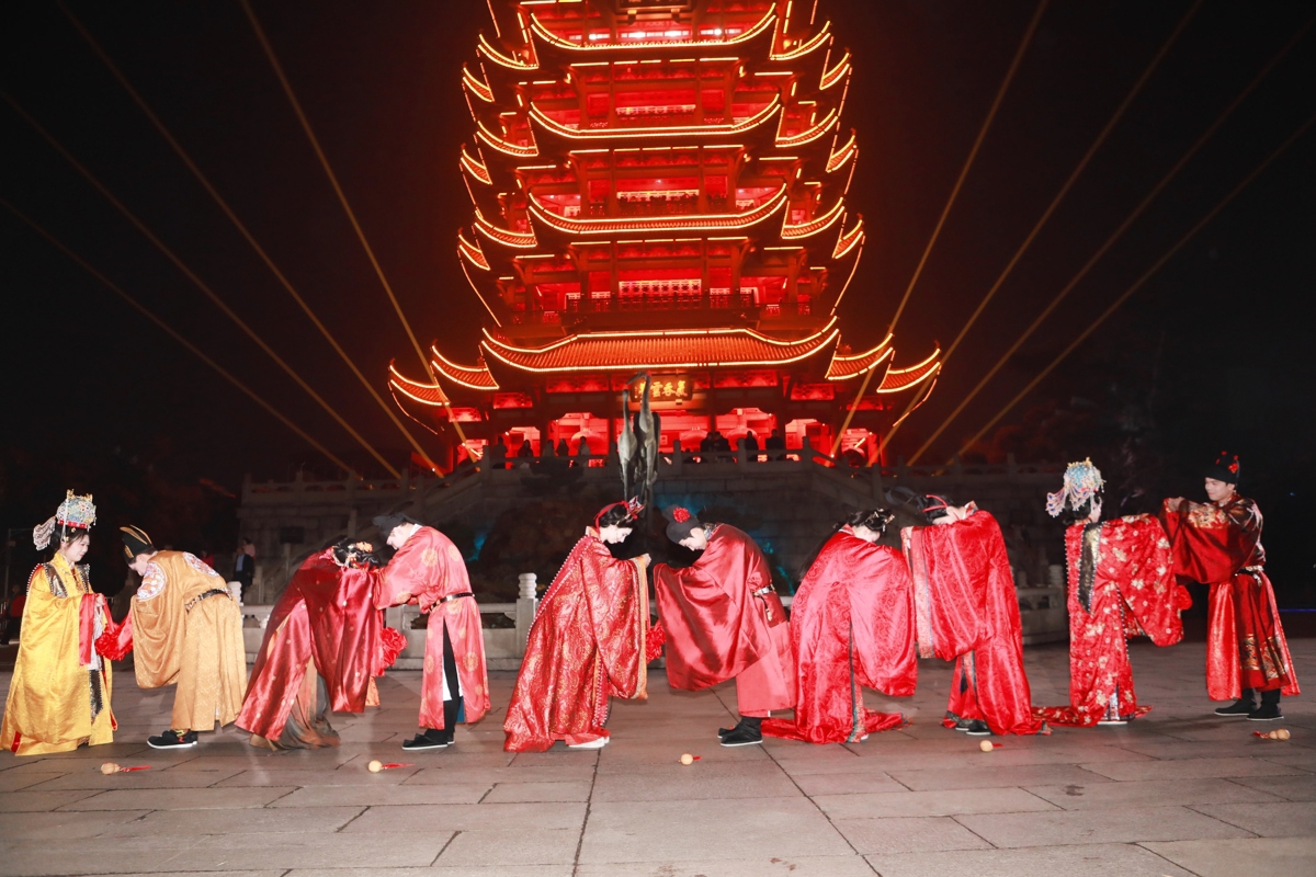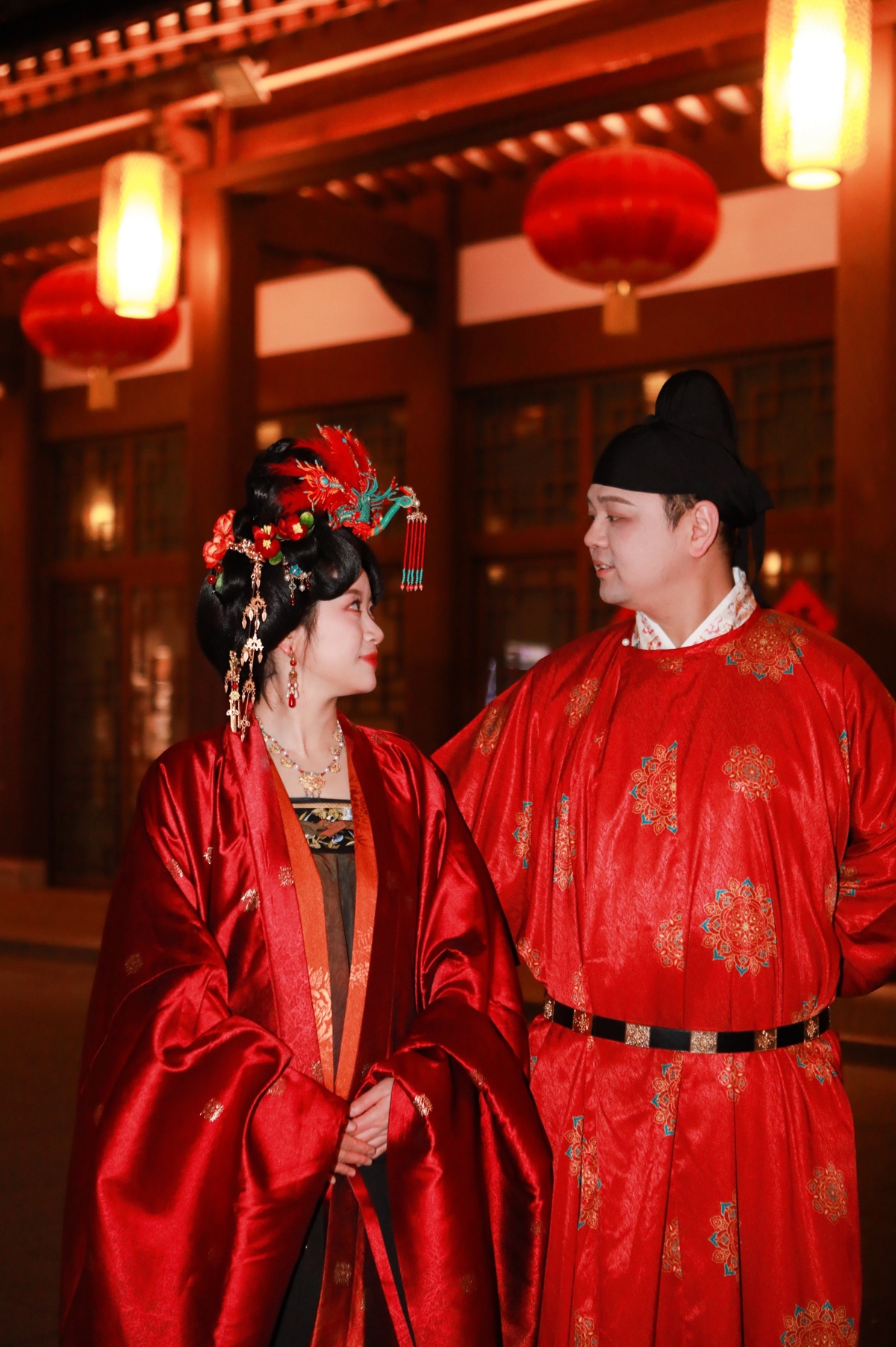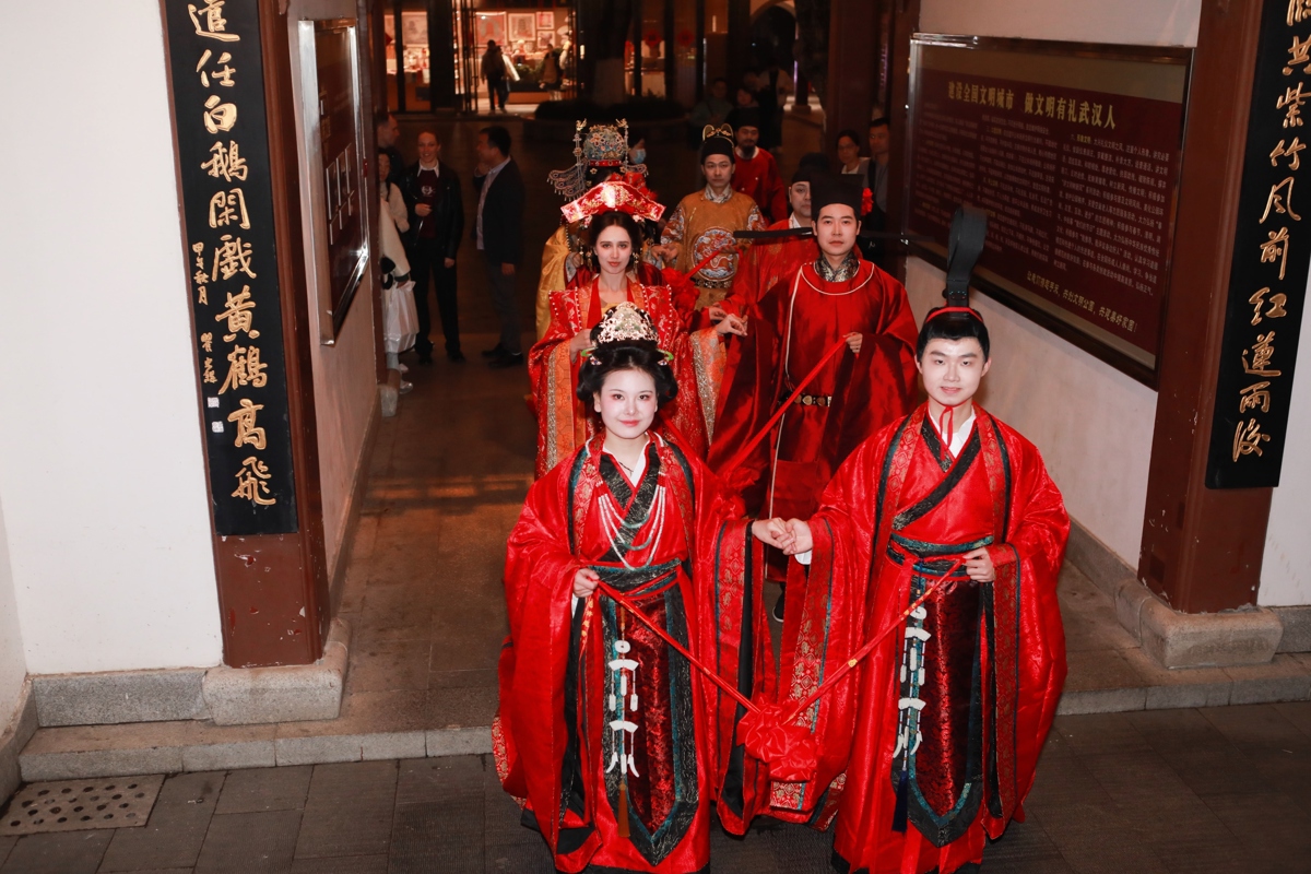 3月20日晚上的黄鹤楼,情侣们身着华美传统汉服,在千年古楼的夜色与樱花烂漫中,共同见证爱情的誓约与中华婚礼文化的传承。活动以“开大礼”为序,现场吟诵典雅诗文,重现秦晋之好、四朝婚典的华美场景。