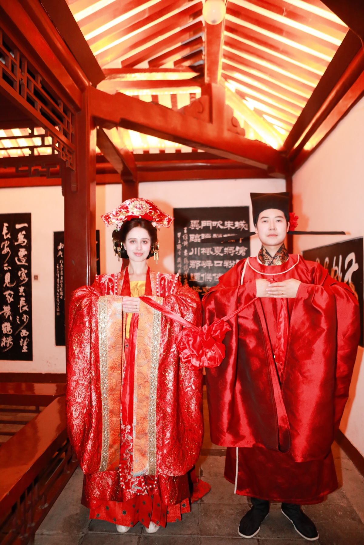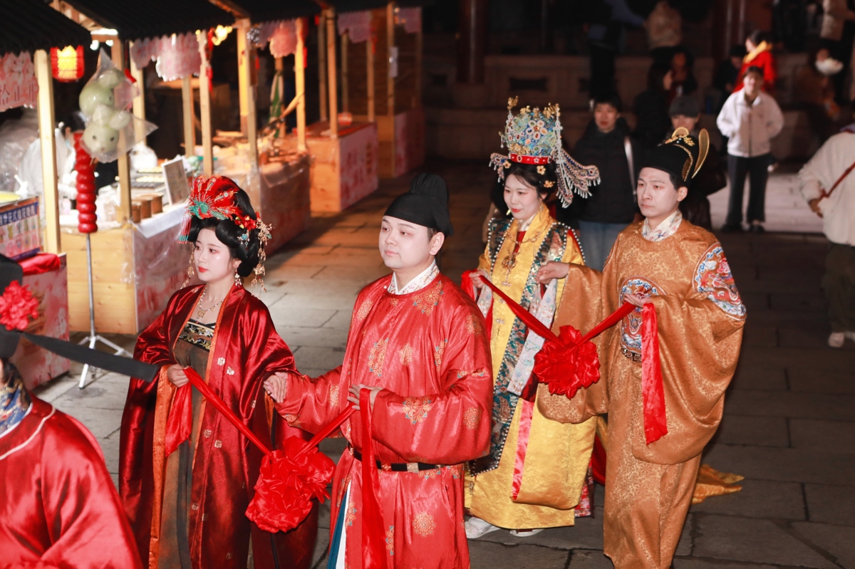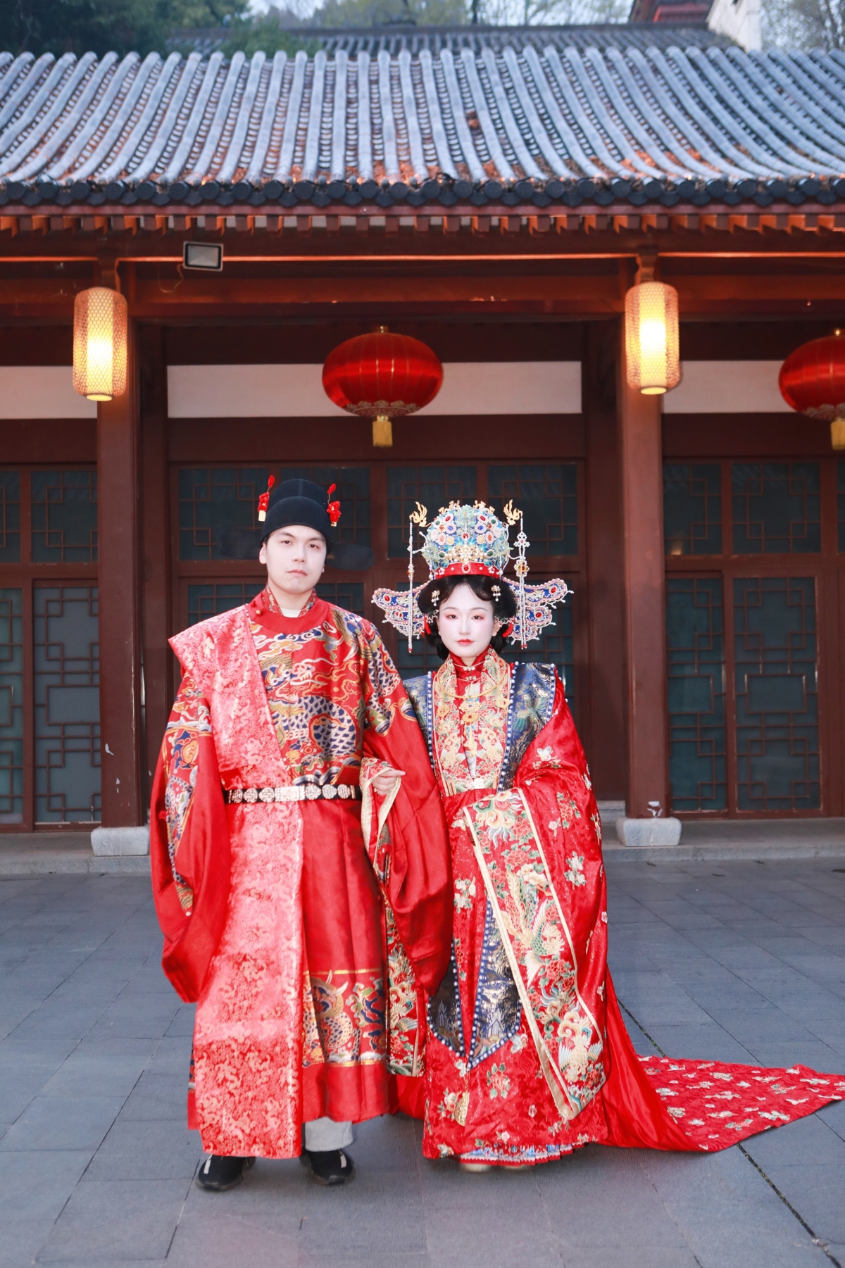 3月20日晚上的黄鹤楼,情侣们身着华美传统汉服,在千年古楼的夜色与樱花烂漫中,共同见证爱情的誓约与中华婚礼文化的传承。活动以“开大礼”为序,现场吟诵典雅诗文,重现秦晋之好、四朝婚典的华美场景。
