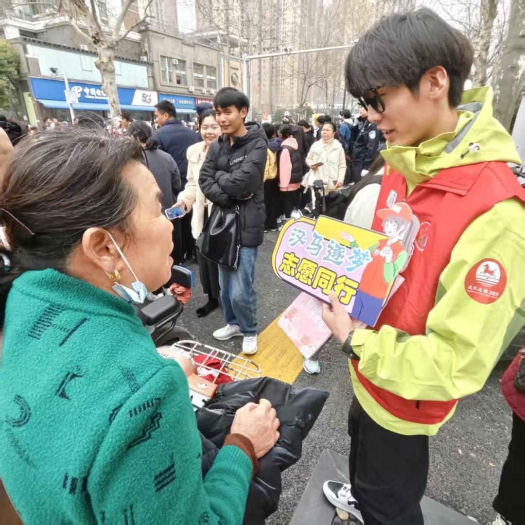 来自内蒙古的王先生,一路辗转来到武汉,却在前往赛程终点途中迷了路,焦急的他正巧遇到武汉文旅志愿者。志愿者们耐心询问,热情指引他前往樱花大道。终于能站在赛道旁见证汉马冲刺的热血瞬间,王先生难掩激动:“跨越三千里来到江城,很感动,谢谢志愿者带我见证这场盛会!”