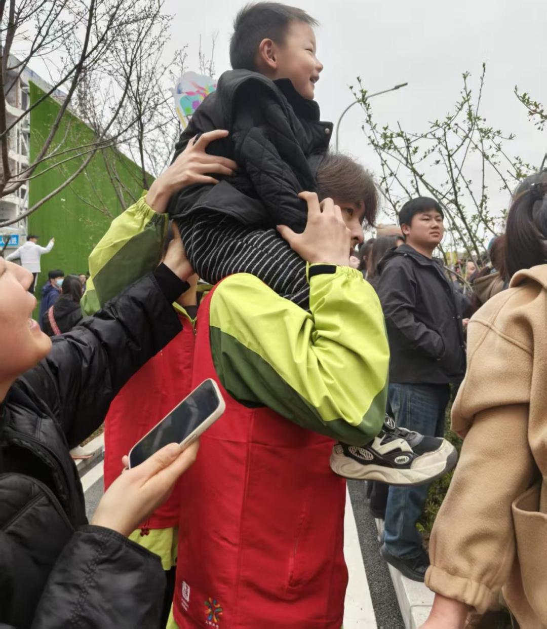 “看到啦!看到啦!选手冲过来了!”孩子们清脆的欢呼声此起彼伏。胡帅稳稳地托着孩子,用自己的肩膀为他们搭起了一个结实的“观赛台”,也为他们留下了美好的童年回忆。