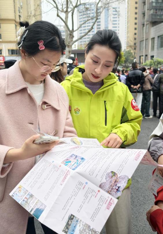 攀谈中得知,李女士从深圳专程赶来给参赛的丈夫加油助威,赛后还想和丈夫一起逛逛武汉。了解情况后,刘涛立刻递上一份武汉文旅赏樱地图,贴心的指引让李女士满心欢喜:“太好了,有了这份地图,我们的武汉之行就不用愁了!”