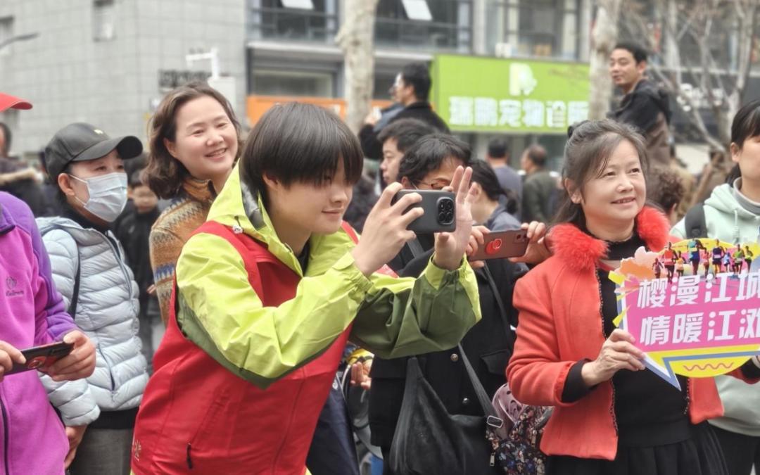 在赛事终点青山江滩旁的“樱花大道”冲刺路段,烂漫春花下人头攒动,欢声如潮,武汉文旅志愿者穿梭其间,以热情、专业、细致的服务为赛事保驾护航,一抹抹志愿红,绘就了赛道旁动人的城市风景。
