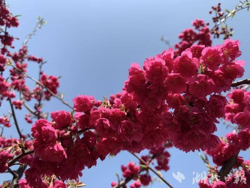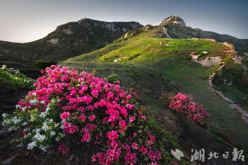 山下,沿途一公里长的海棠花正红得热烈,夹道欢迎前来登高的游客;山上,万亩野樱花落英缤纷,万亩映山红如霞似锦。