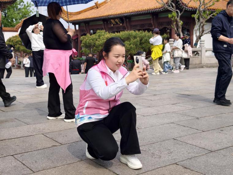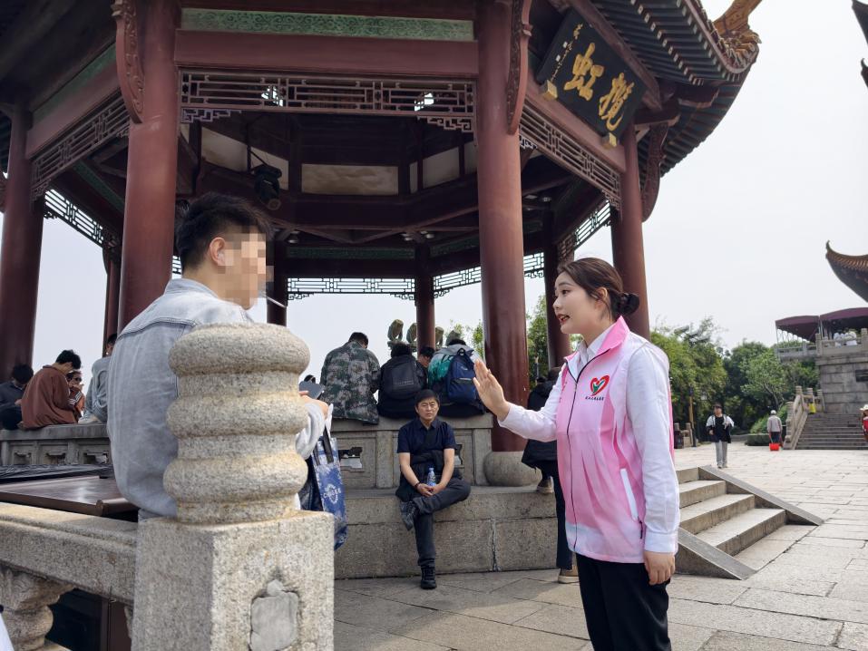 志愿者彭超君化身“活导航”,为往来游客精准指引方向:“卫生间就在您左手边这条小路进去,直行20米就到。”“景区出口顺着主路向下,跟着指示牌走就行。”简单明了的回答,高效解决了游客的出行难题。她还不忘时时提醒:“这边台阶有点陡,您慢一点,注意脚下安全。”贴心的话语、清晰的指引,让游客们连连点头道谢。