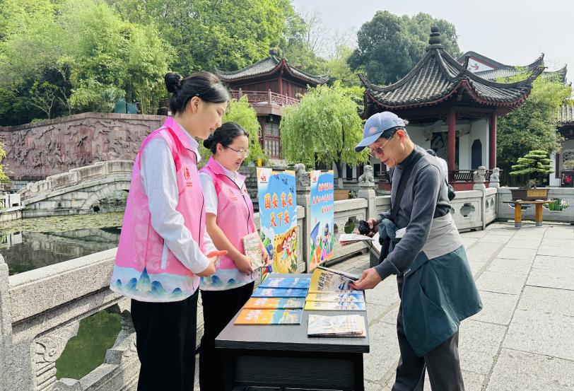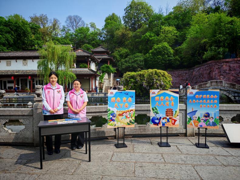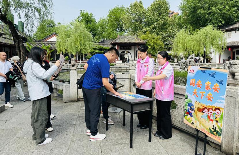 鹅池旁,流水潺潺、绿意盎然,志愿者郑颖、王姝焓站在全民国家安全教育日宣传展台前,与游客互动交流,用通俗易懂的讲解,让安全理念入脑入心。“您知道全民国家安全教育日是哪一天吗?”“12339是国家安全举报电话,大家都可以记一下。”