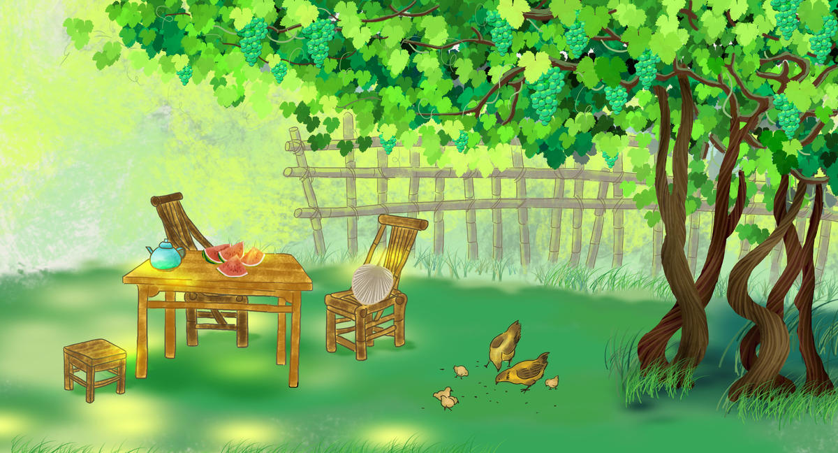 一步一步,小珊固执地回过头。她的视线模糊了。那渐渐离去的葡萄架融成了一片深深浅浅的、朦胧的绿色。