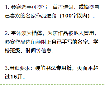 投稿的硬笔书法作品需为楷体,参与者可抄写一首古诗词,或摘抄自己喜欢的名家作品选段(100字以内),需用硬笔书法专用纸书写,页面不超过16开。书法作品边角必须附上手写姓名、学校、时间等信息,以防被他人冒用。