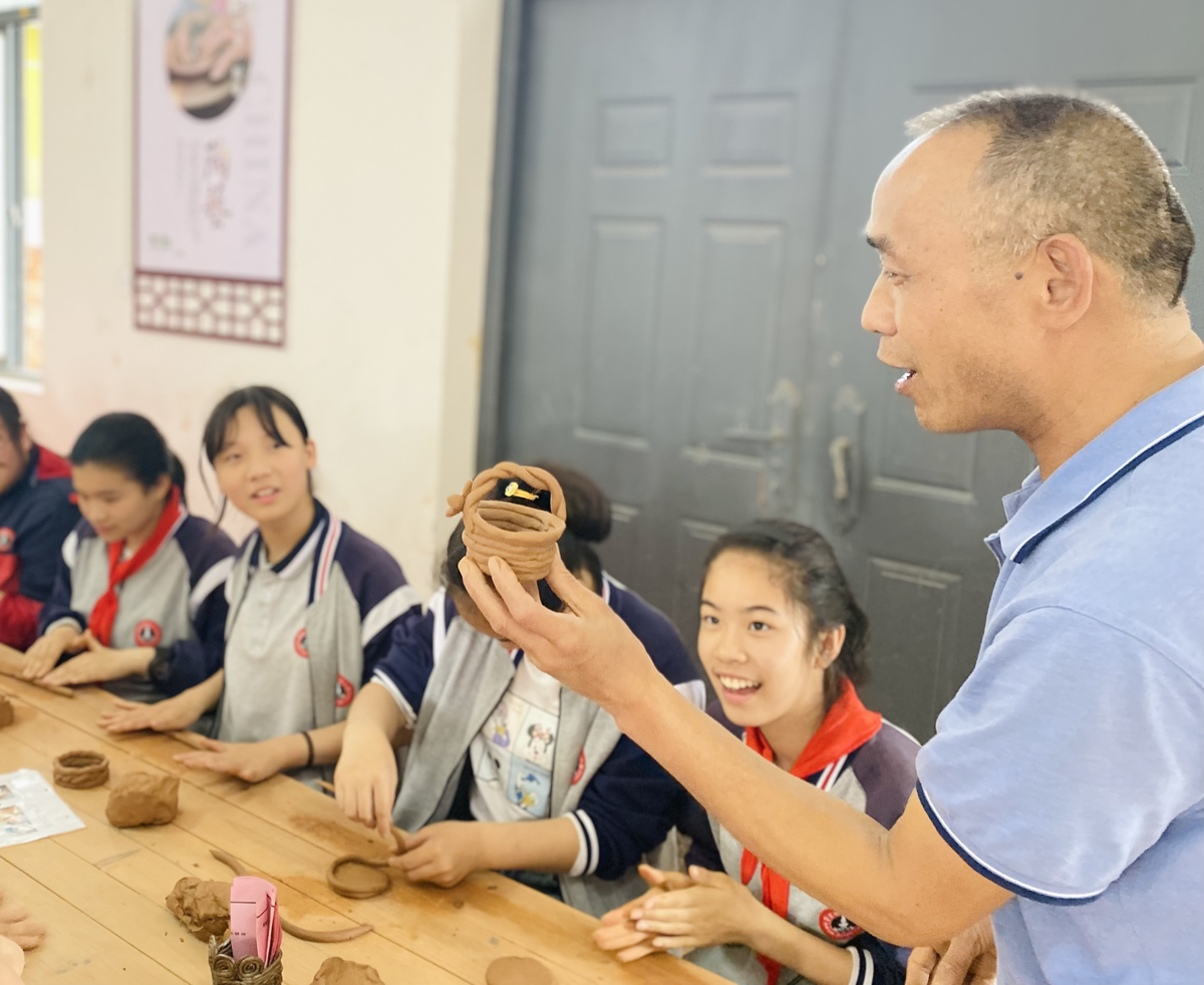 刚进园区,学生便被扑面而来的艺术气息深深吸引,迫不及待地跃跃欲试。“咱们一定要保证桌面平整,还要确保器具干净卫生,做容器的时候底座要平、周身要正、表面无瑕,才能做出一个好的容器。”制陶非遗传承人王老师给学生们介绍道。随后,王老师拿起陶艺作品给大家示范制作要领,在制作过程中,王老师说:“制作陶艺跟做人也一样,要踏实、要有正气、洁身自爱,才能行稳致远。”