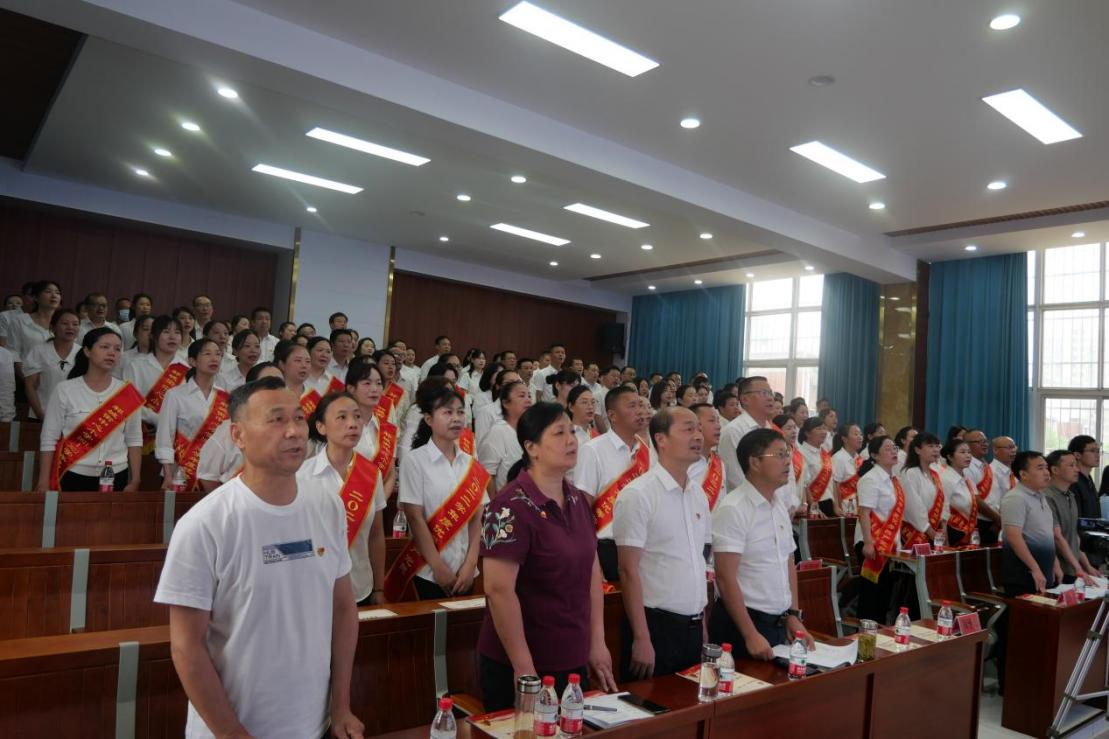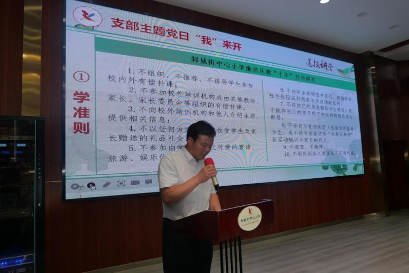 活动伊始,现场党员佩戴党徽,统一着装重温入党誓词,校党总支书记阮孟强带领与会人员学习邾城街中心小学廉洁从教“十不”行为规范,筑牢教师思想道德防线。