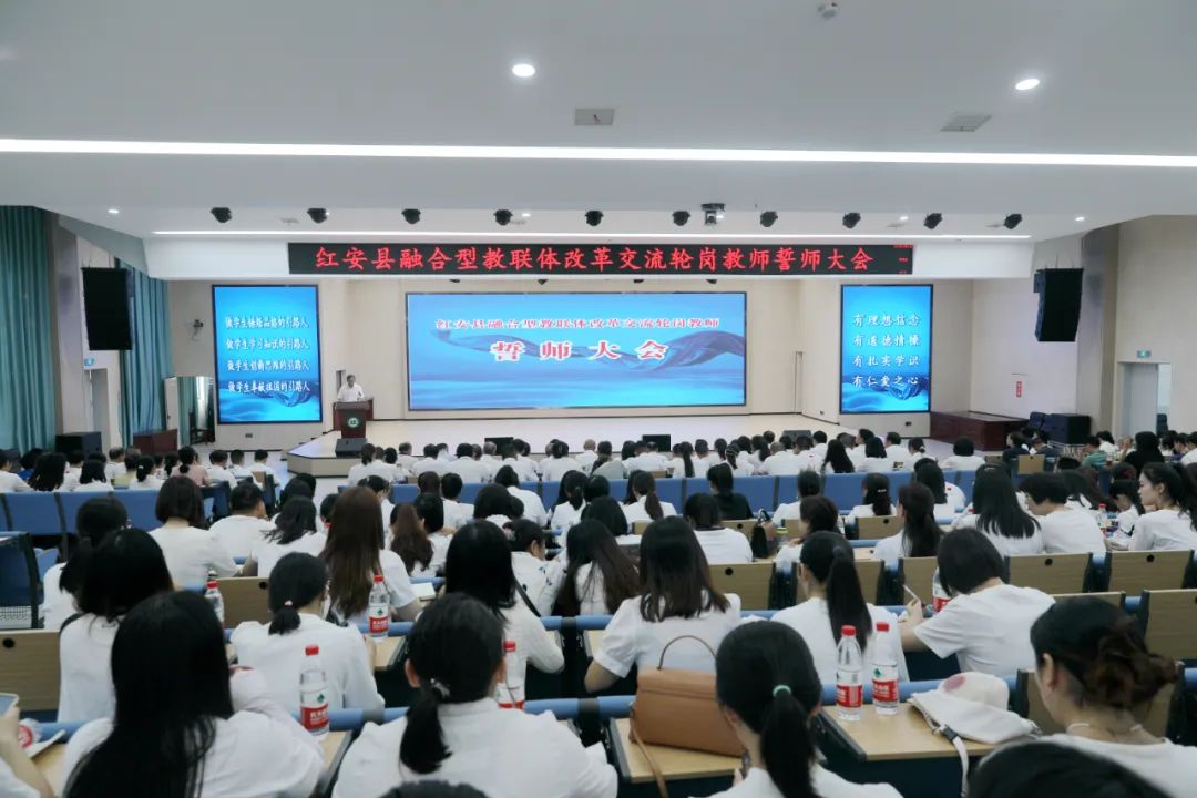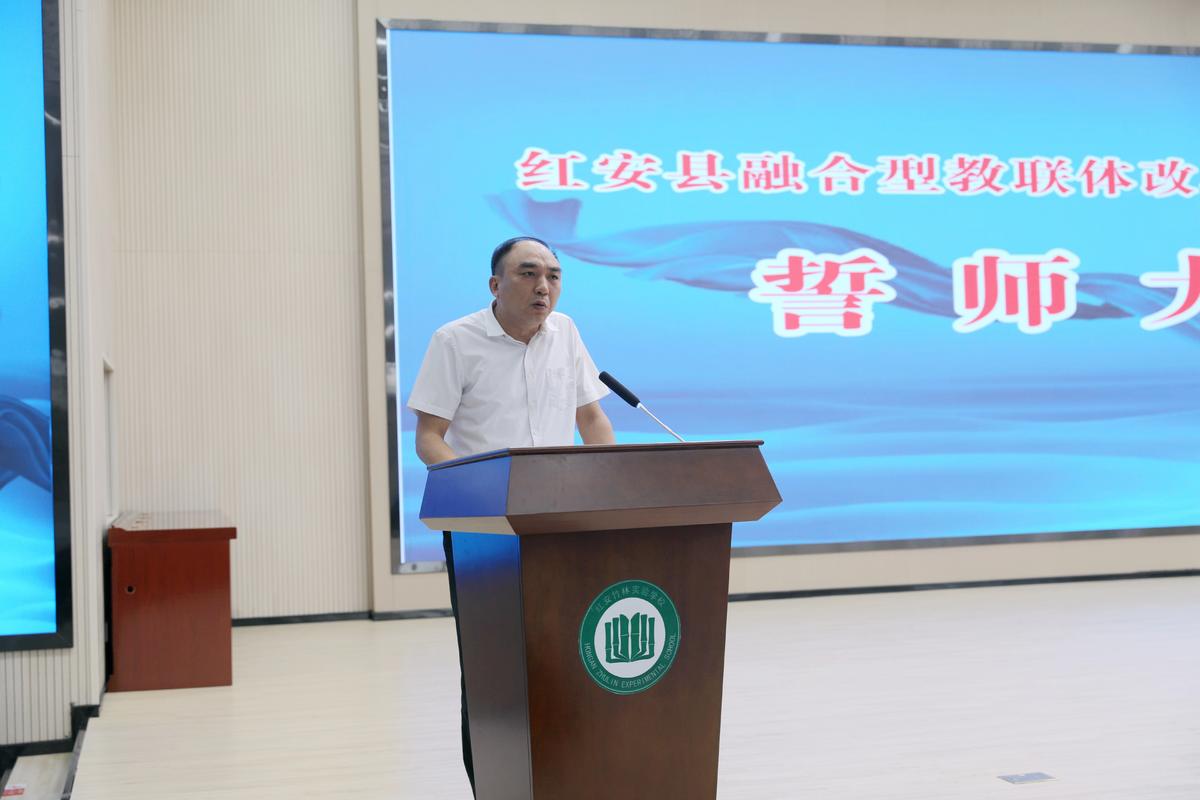 “我是一名光荣的人民教师,我志愿参与教联体改革交流轮岗,忠诚党的教育事业……争当红安教育改革发展的排头兵!”8月31日,在红安县融合型教联体教师交流轮岗誓师大会上,县教育局党组书记、局长曾红波带领近四百名交流轮岗教师庄严宣誓。