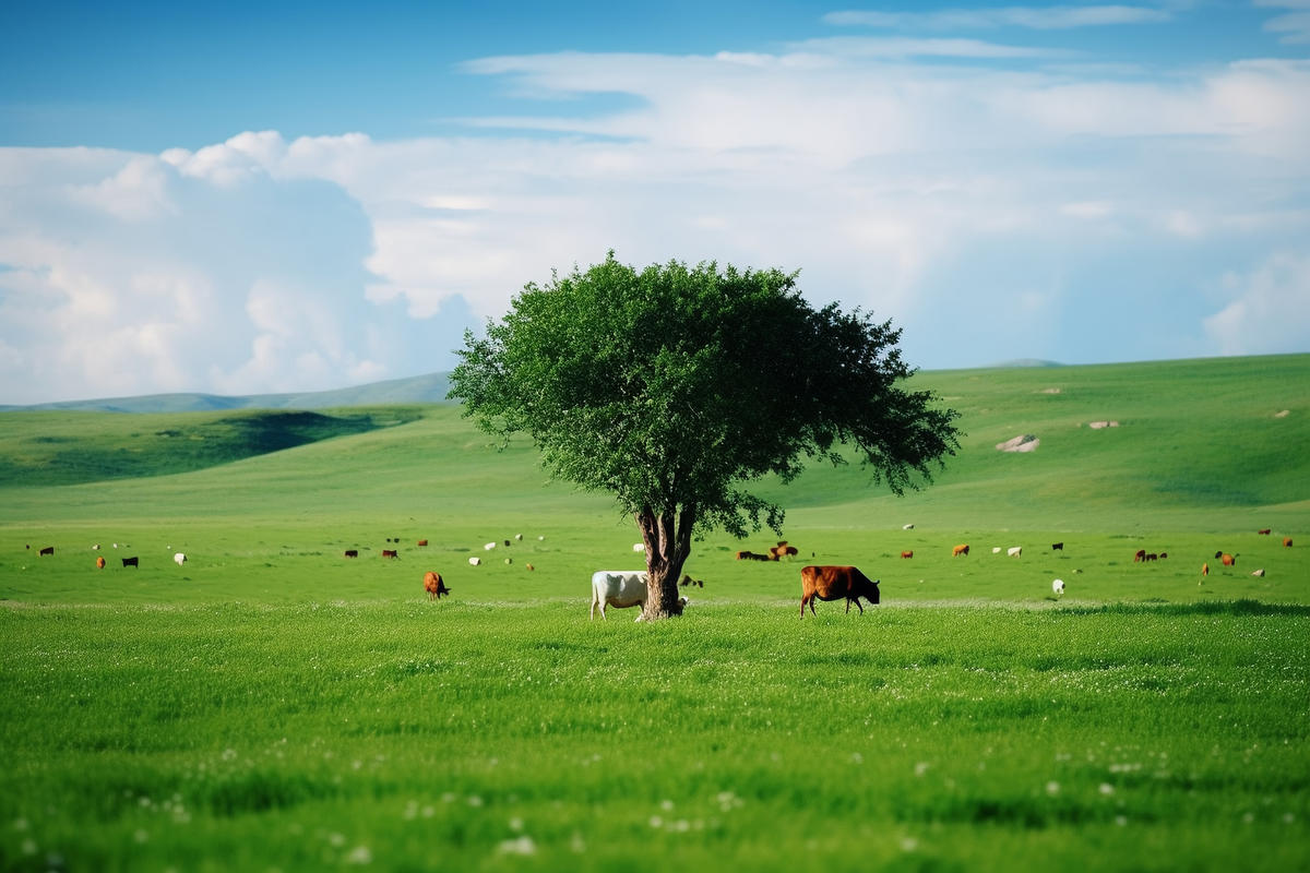 白日里,牧场是动物们的天堂,无论是花色多样的牛,还是骏马或羊、猪、鸡,在“见不到一个人影的绿草低地上”是那样悠然自得、惬意舒畅,广阔无垠的草原,无疑就是它们的自由王国,好一幅家禽家畜安闲游憩图。