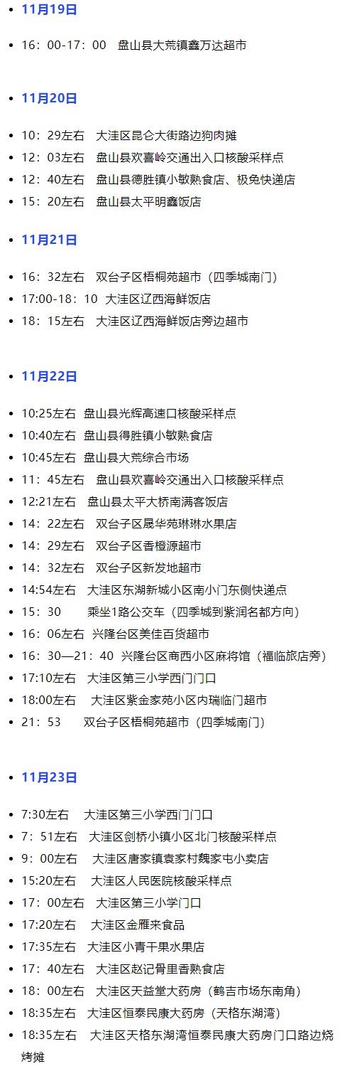 11月24日0—12时,辽宁省盘锦市发现10例核酸结果阳性人员,核酸阳性人员隔离管控前相关活动轨迹公布如下: