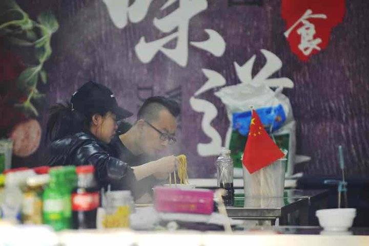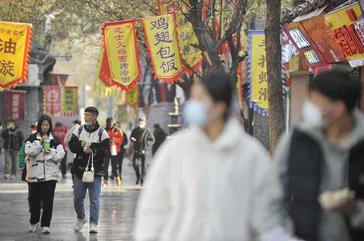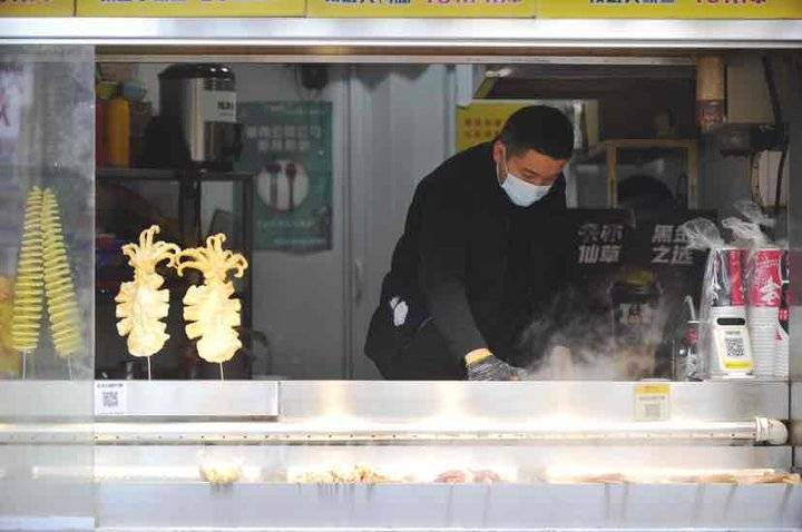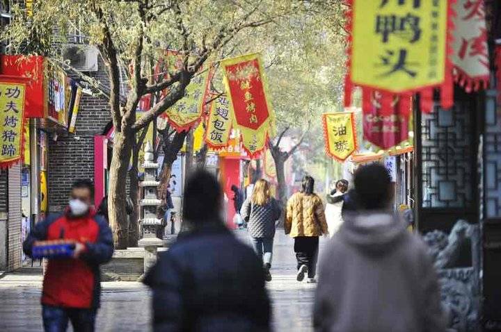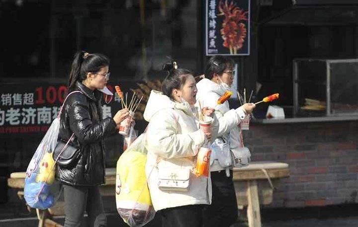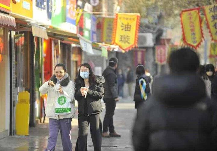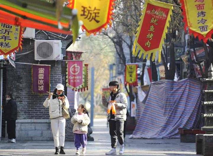 12月7日,在济南宽厚里美食街上,市民们三三两两漫步其中,品尝着久违的美食。