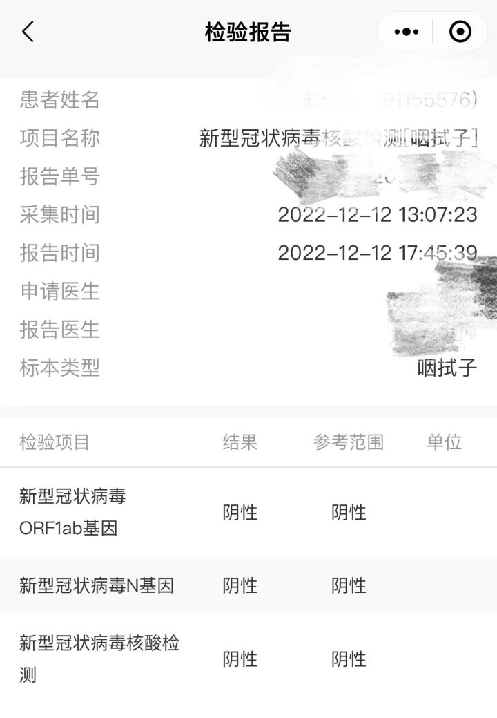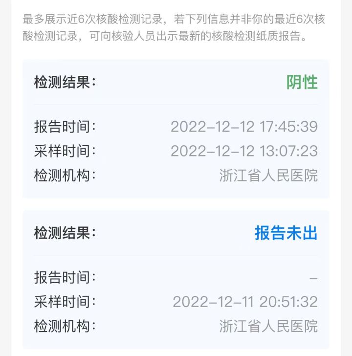 按照要求,记者在12日13点07分做了“单管”检测,当天17点45分,浙江省人民医院小程序上便可查询到“结果为阴性”的记录,但健康码并未转绿,且“核酸检测结果”一项直到13日中午仍显示“报告未出”。