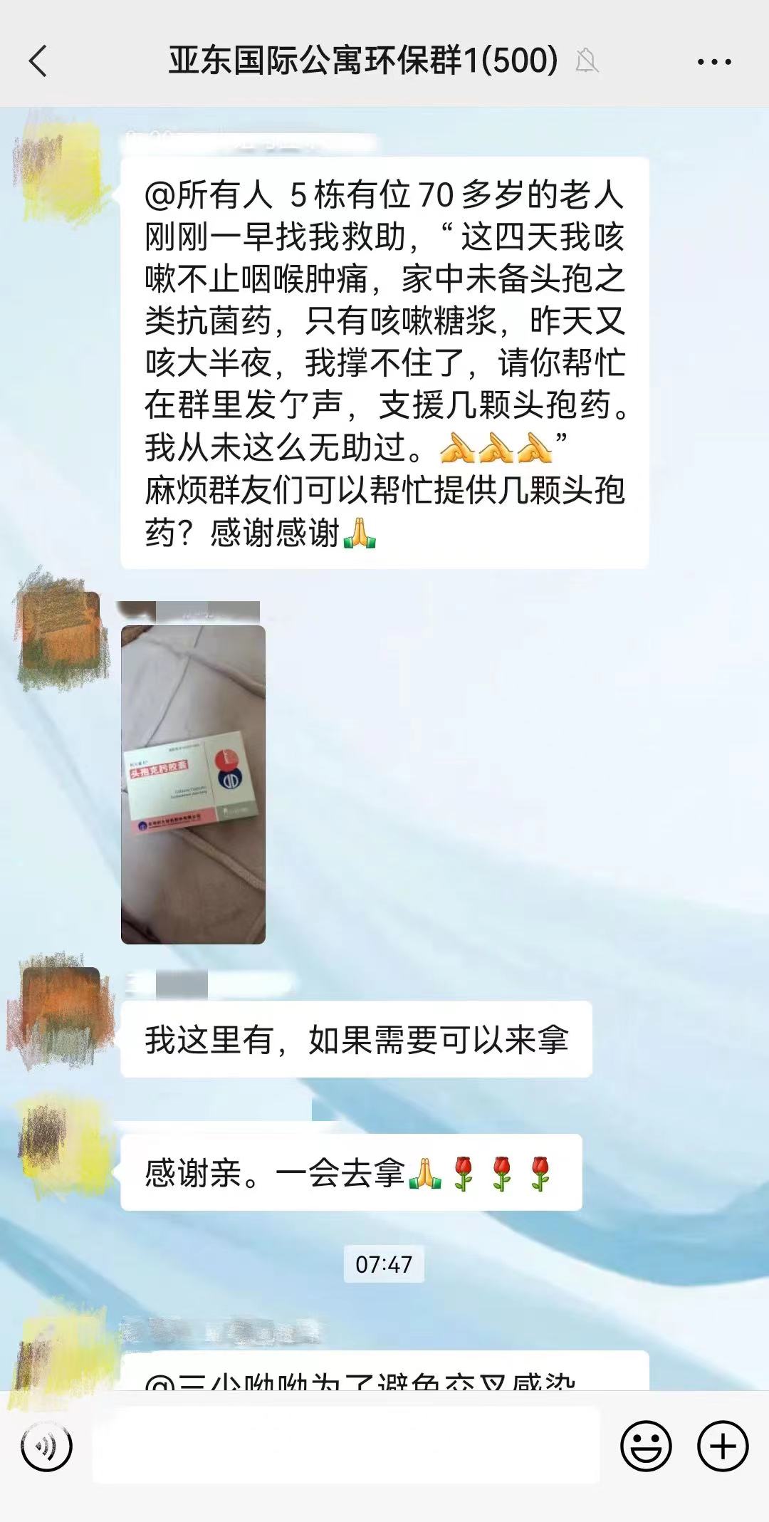 “5栋有位70多岁的老人一早找我求助,说这几天咳嗽不止咽喉肿痛,麻烦群友们可以帮忙提供几颗头孢药吗?”早晨7点多,在南京市雨花台区亚东国际公寓的业主群里,有住户发消息求助。不到两分钟,15栋的住户拿出家里的一盒头孢克洛胶囊,“我这里有。”他将药品用塑料袋包装好,放在楼下的订奶箱中,无接触地完成了药品的共享传递。