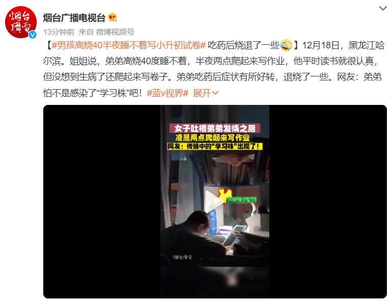 新冠病毒不仅在生理上带来各式各样的副作用,甚至在工作学习上也给患者加上了buff。据烟台广播电视台报道,在黑龙江哈尔滨,男孩高烧40度睡不着,半夜2点爬起来写作业,有网友直言“弟弟怕不是感染了‘学习株’吧!”