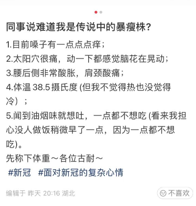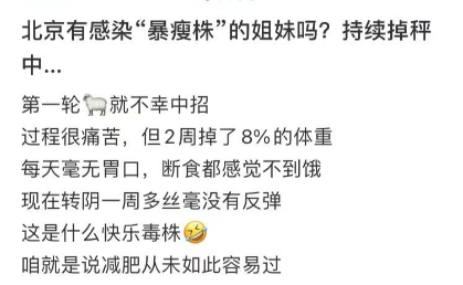 与干饭株相反的是暴瘦株。有人感染后食欲不振,闻不了油烟味,吃啥吐啥,2周掉了8%的体重,转阴之后都没有反弹,减肥从没有这么容易过。