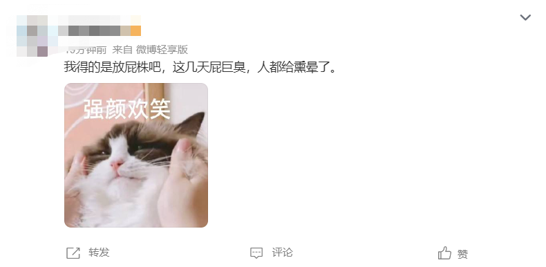 感染新冠,胃口出现变化,喉咙沙哑疼痛,或者流泪流涕都很正常,但有些网友的症状就略显“尴尬”了。有网友表示自己在感染新冠后,肠胃功能出现问题,拉肚子、喜欢放屁,把自己感染的毒株戏称为“放屁株”。