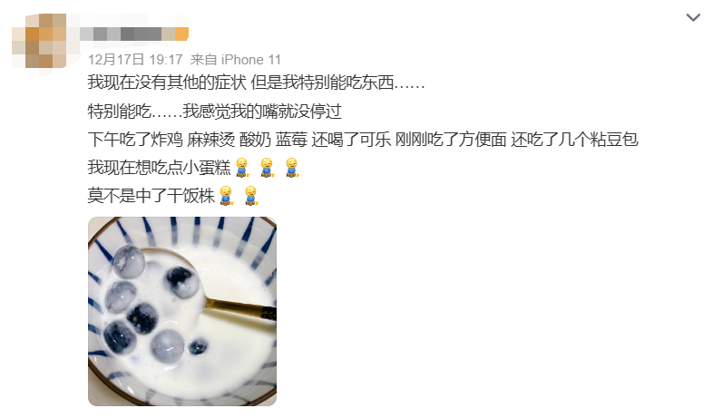 幸运的是有人痛失味觉,有人却在感染后食欲大增,感觉嘴就没停过,吃得甚至比平时还多,戏称自己感染的是“干饭株”。