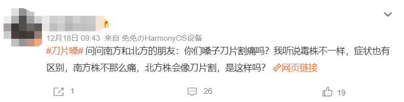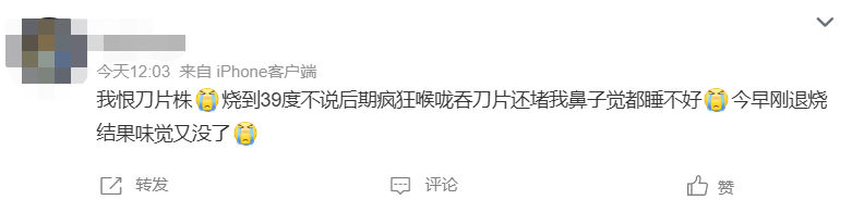 有很多网友表示阳了之后嗓子干痛,吞咽时十分疼痛,感觉像在吞刀子、生吞狼牙棒,甚至将其称作“刀片株”。