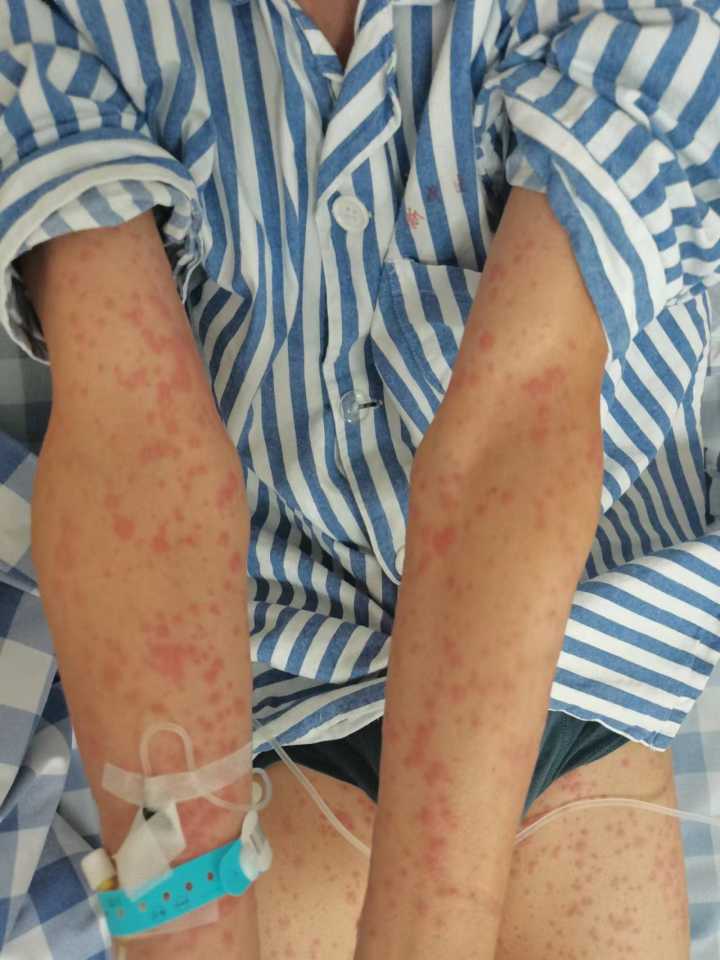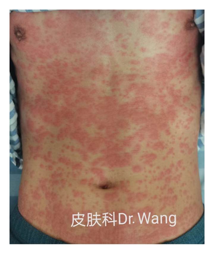 30岁出头的廖先生出现感冒样症状后,自己在家量了一下体温,显示是低热,37.8℃。由于他前期准备工作做得比较充足,家里囤的药比较多,于是连续吃了三种药物,一种头孢类的抗生素,还有退热药,再加一个抗病毒的中药。吃了之后,过了3天,廖先生从头到脚都出现密密麻麻的红斑、丘疹,瘙痒特别明显。然后来到王小勇医生的门诊求助,经过问诊和全面检查后,诊断为药疹。