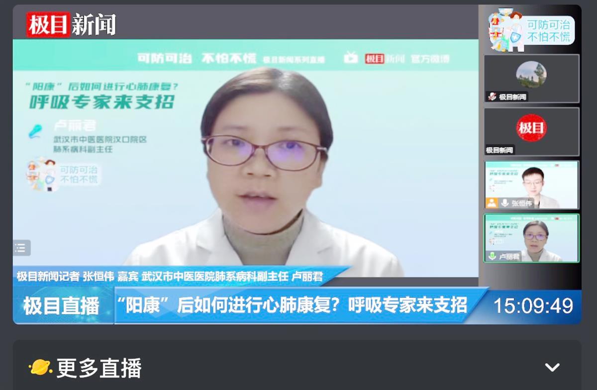 随着“阳康”人群的增加,越来越多人关心如何更好地进行心肺康复。12月28日下午3时,武汉市中医医院汉口院区肺系病科副主任卢丽君,做客“可防可治,不怕不慌”极目新闻系列直播节目,为广大网友进行讲解。
