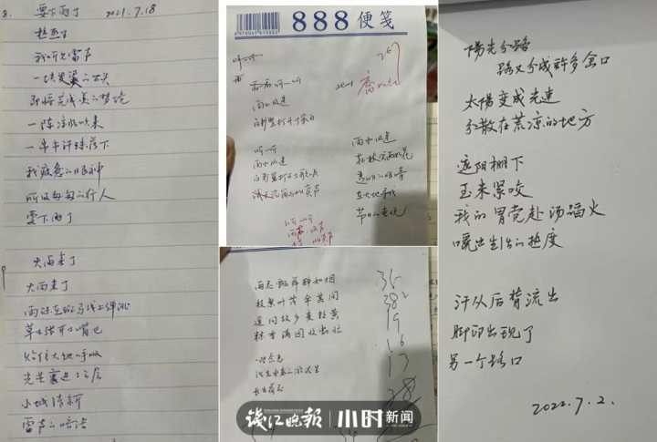 直到长大成人,老赵依然保持着写诗的习惯,粗略地算了下,这些年,老赵写了300多首诗和200多篇随笔,大部分内容都记在两本厚笔记本里,但不慎丢失了,剩下的则记在朋友圈、货单、账本、碎纸片上……