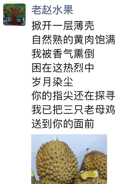 据老赵说,这首诗的灵感来源于“一只榴莲三只鸡”这句俗语,意思是榴莲的营养价值很高。