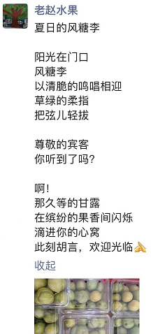 从2016年起,老赵开始在朋友圈写诗,“以前我觉得我的诗像说话一样,缺少意境,经不起推敲。”但让他意外的是,自己的诗收获了很多朋友的点赞和关注。在大家的鼓励下,老赵开始在朋友圈晒诗。他用一首首浪漫的诗歌,为自家水果吆喝。