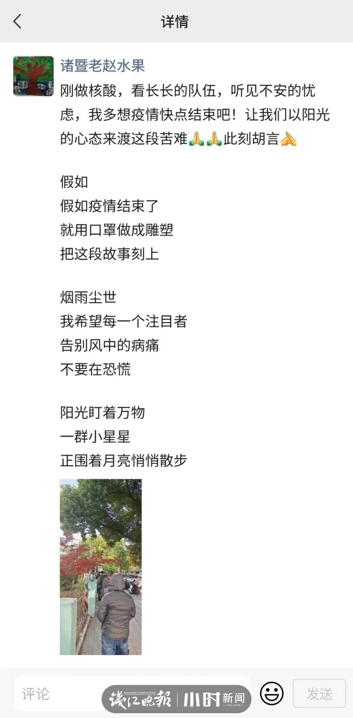 如今,老赵希望此刻的疫情尽快过去,他在朋友圈写道:“假如,假如疫情结束了,我希望每一个注目者,告别风中的病痛,不要再恐慌。”
