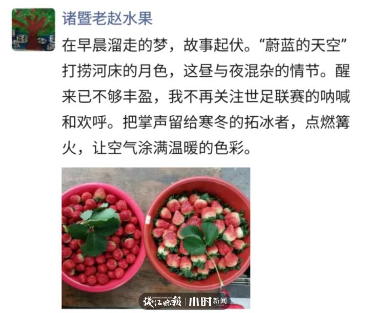 元旦已过,老赵的水果店里人气不减,不少人来采购水果,“买橙子、橘子、梨的人最多,之前被嫌弃的柠檬也成了香饽饽,和最近感染新冠的人比较多有关系。”老赵说,他手上的“活计”也没放下,前不久还为刚上市的草莓写了一首诗。