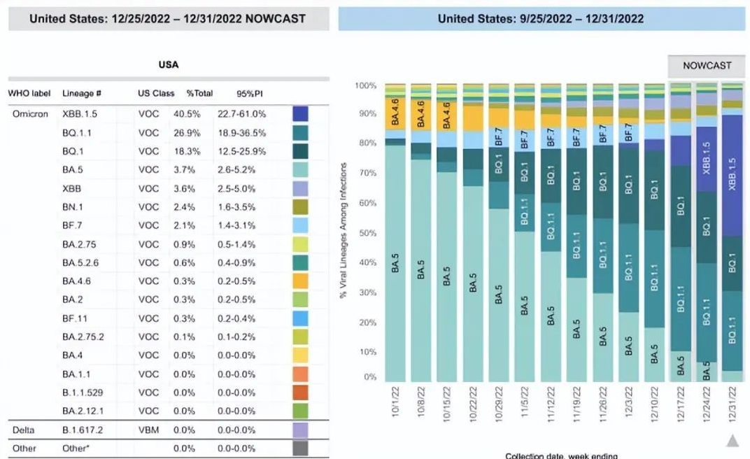 美国疾控中心于2022年12月30日公布的数据显示,当周美国有40.5%新冠病毒感染病例是由高传染性的奥密克戎亚型毒株XBB.1.5引起的,主要症状包括呼吸困难、头痛、喉咙痛、鼻塞、全身疼痛、疲劳和发烧等。