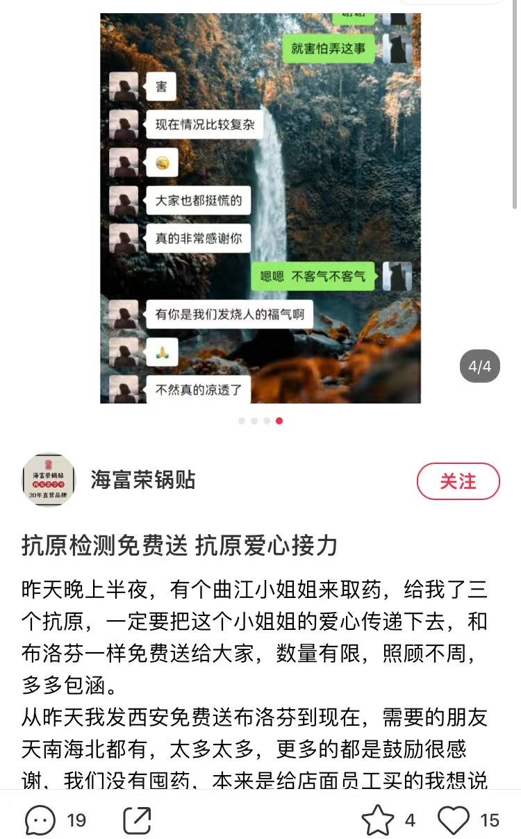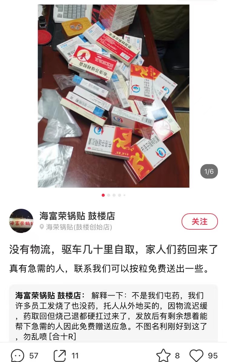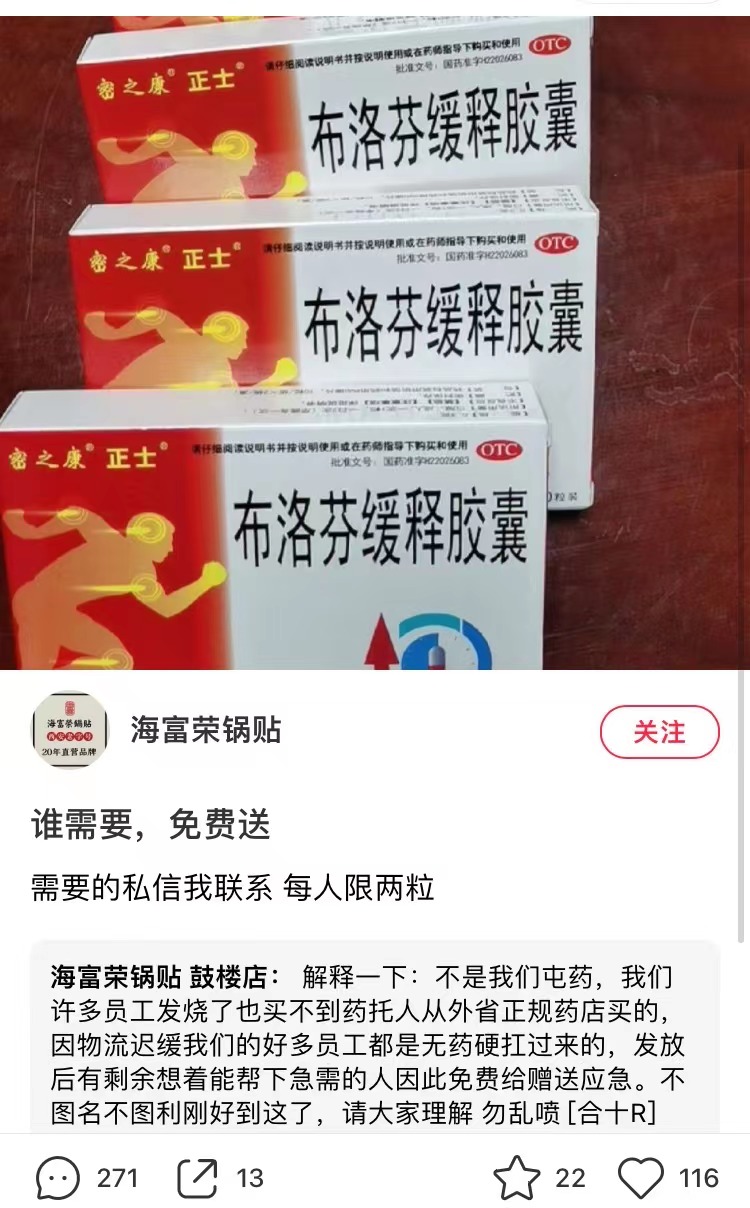 “我们就把药品信息发在社交平台上,给有需要的人免费送,一个人两粒布洛芬,一共送出去20盒。”通过送药,王晓鹏说他也收获了一些意外之喜:有受助者还帮他们在朋友圈宣传他们饭店,也有人留言表示等康复了一定要去吃锅贴……