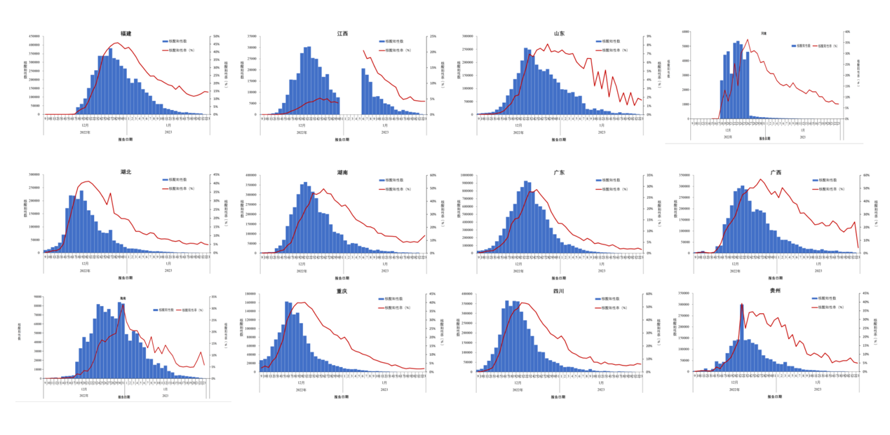 2022年12月9日后,各省份报告人群核酸检测阳性数及阳性率呈现先增加后降低趋势,阳性人数12月22日达到高峰(694万)后逐步下降,2023年1月23日降至最低1.5万;检测阳性率2022年12月25日(29.2%)达高峰后逐步下降,2023年1月23日降低到5.5%。