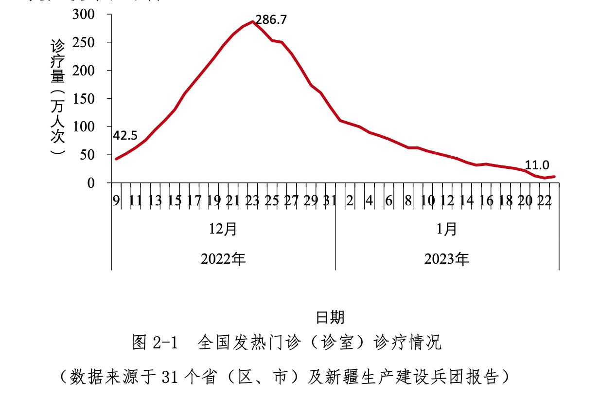 《概述》显示,全国农村地区乡镇卫生院发热门诊(诊室)及全国二级以上医疗机构和城市社区卫生服务中心发门诊(诊室)的就诊人数均在2022年12月下旬达峰,其后于2023年1月下旬大幅回落,较峰值下降90%以上。
