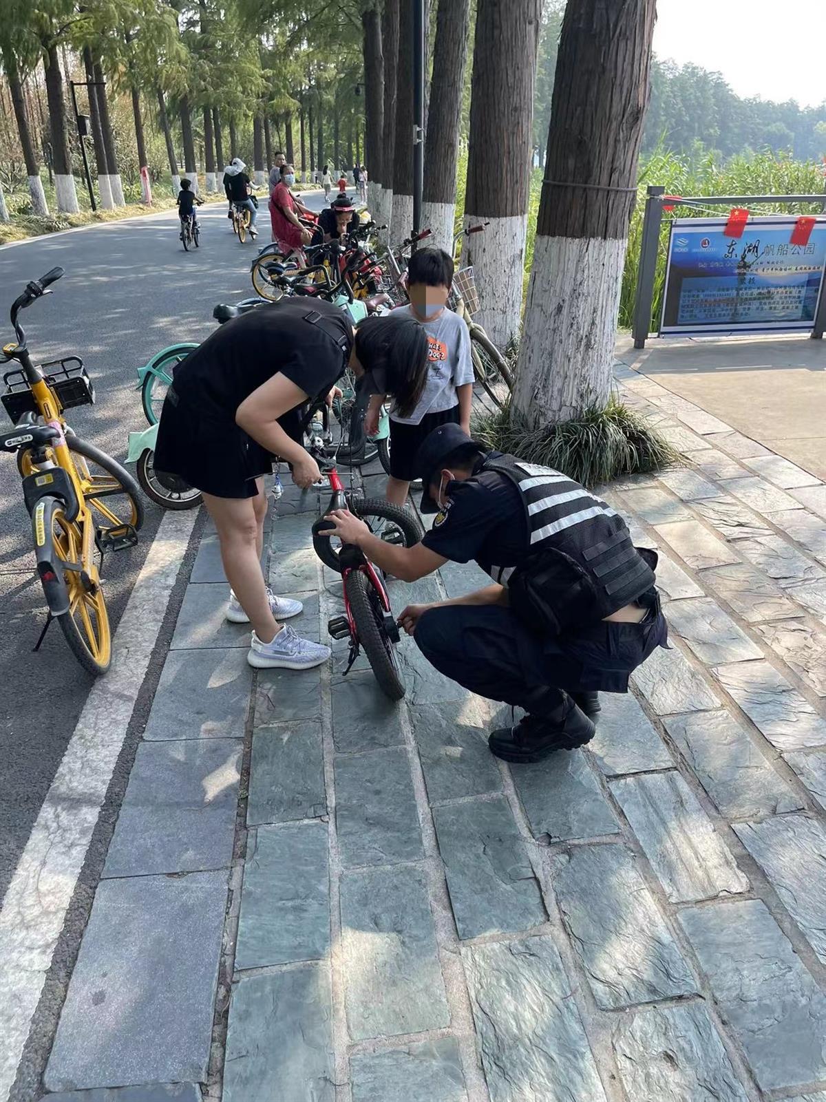 10月1日上午10时许,一名男孩和妈妈来到东湖绿道骑车游玩,在经过湖中道湖心岛时,他自行车链条突然脱落,无法骑行。刚刚还兴致勃勃的小男孩,一看自行车坏了,在妈妈身边哭了起来。