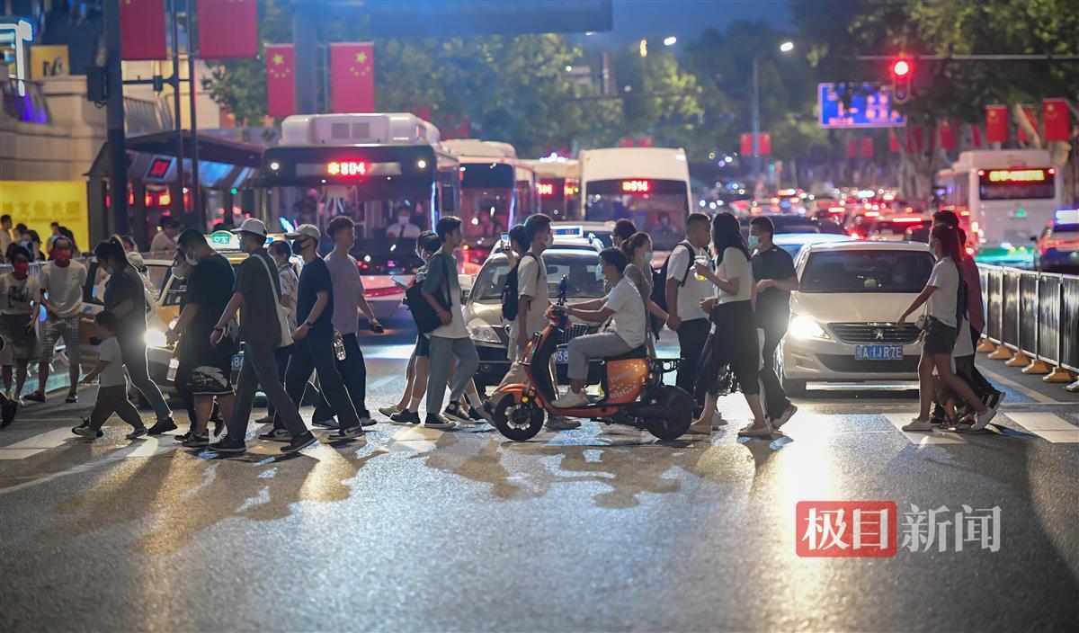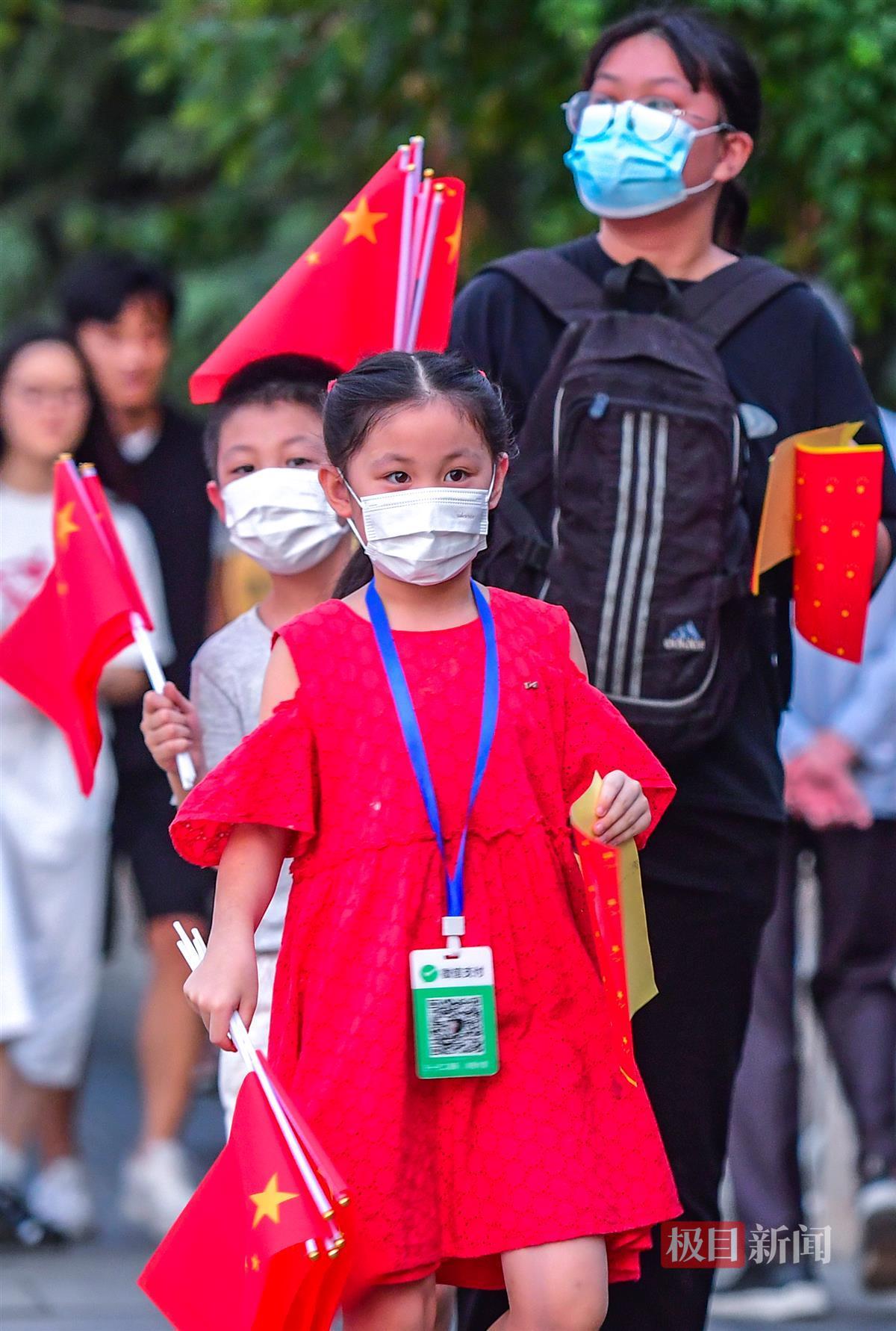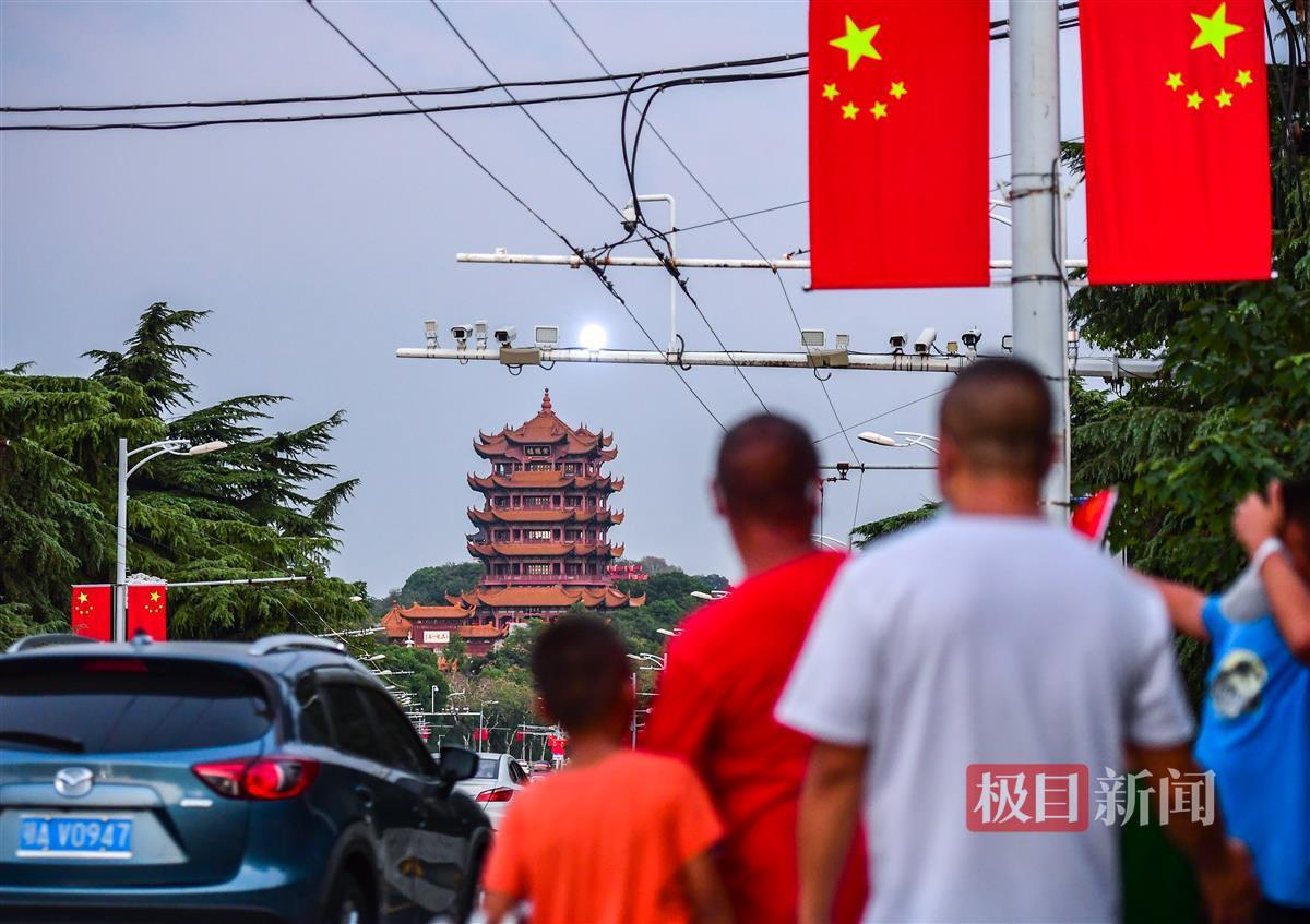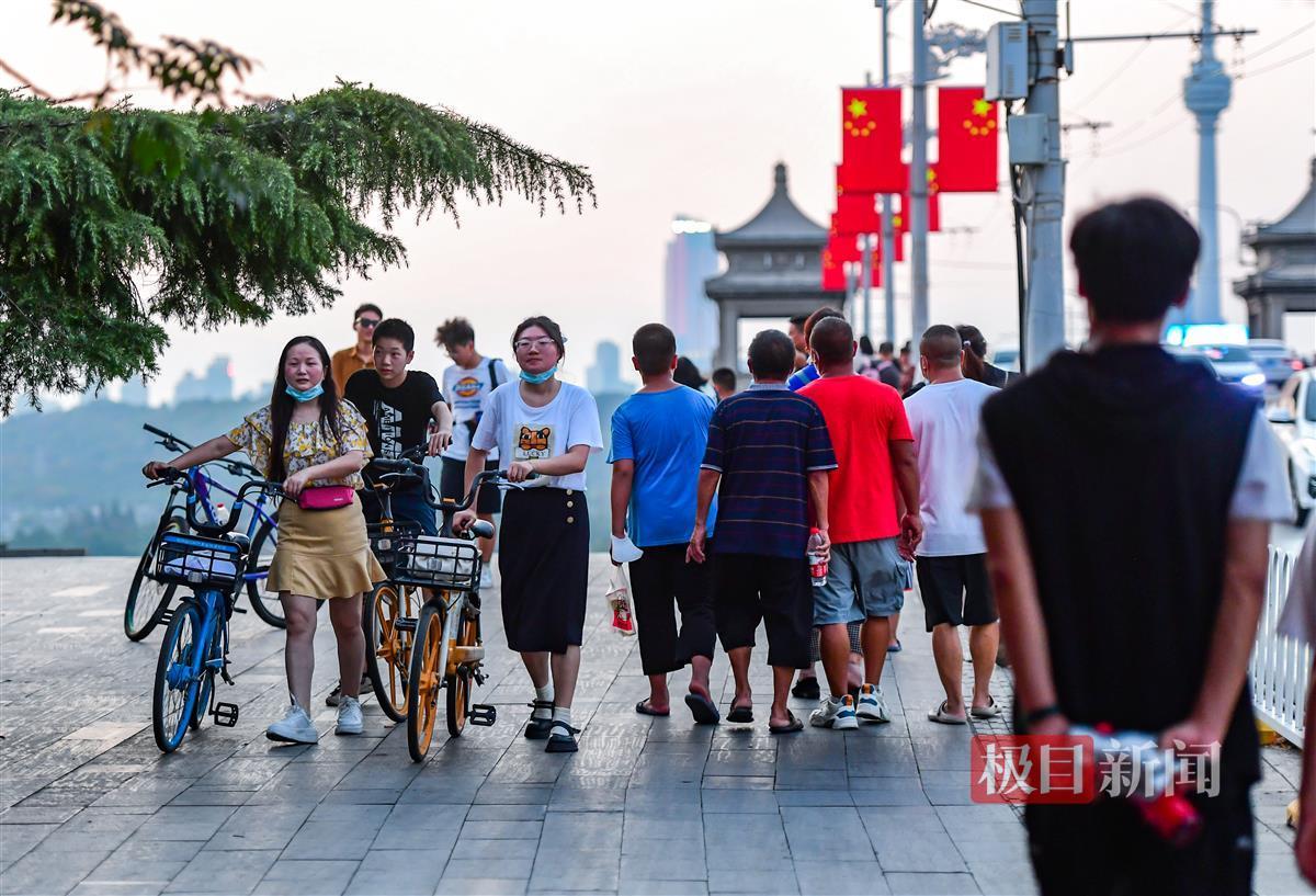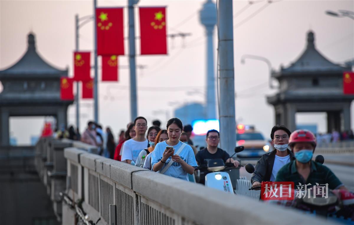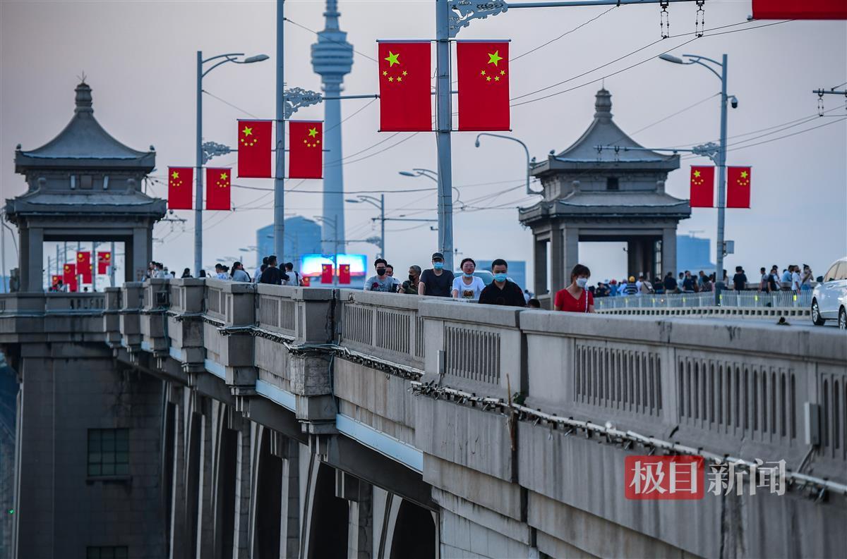 10月1日,武汉长江大桥上,两旁的人行道上熙熙攘攘、人头攒动,游客慕名而至,争睹“一桥飞架南北,天堑变通途”的壮丽景观。